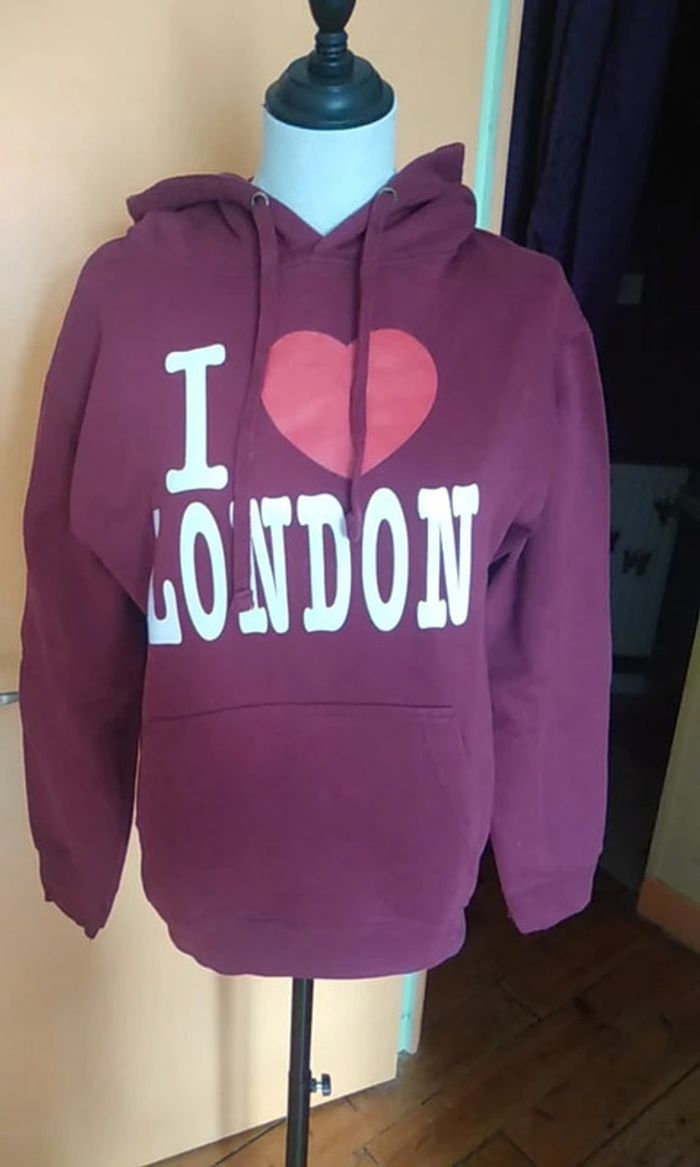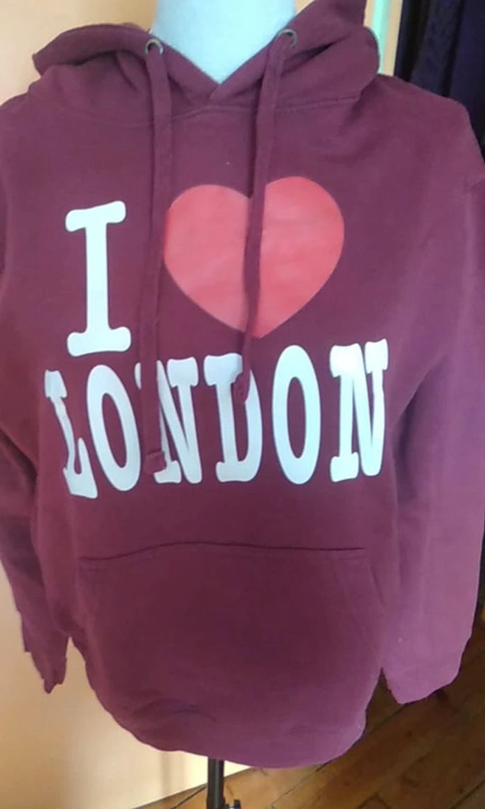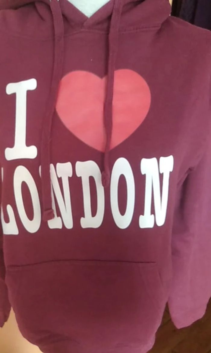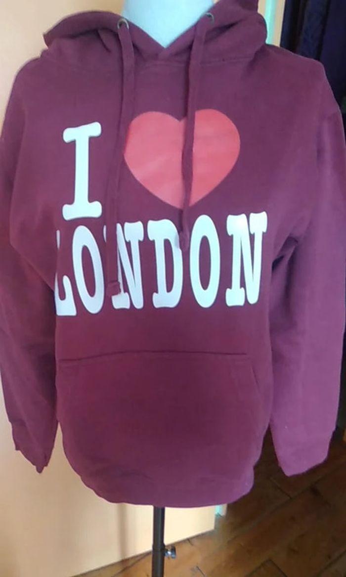 Très joli sweat-shirt à capuche En parfait état Capuche avec cordon de serrage Inscription devant "I LOVE LONDON" Dos uni Poche centrale 80 % coton et 20 % polyester Taille S correspond à une taille 36 #hautfemmetT36eilsel0 #RentréeVinted