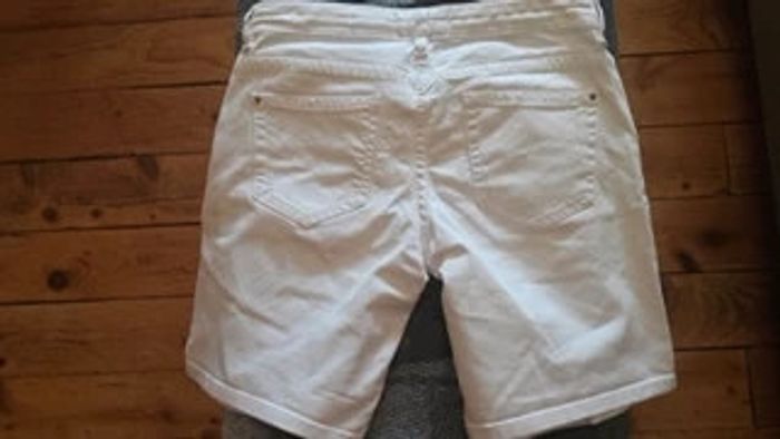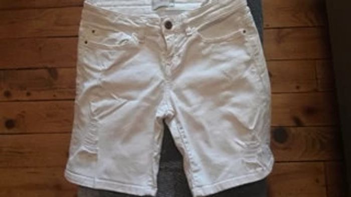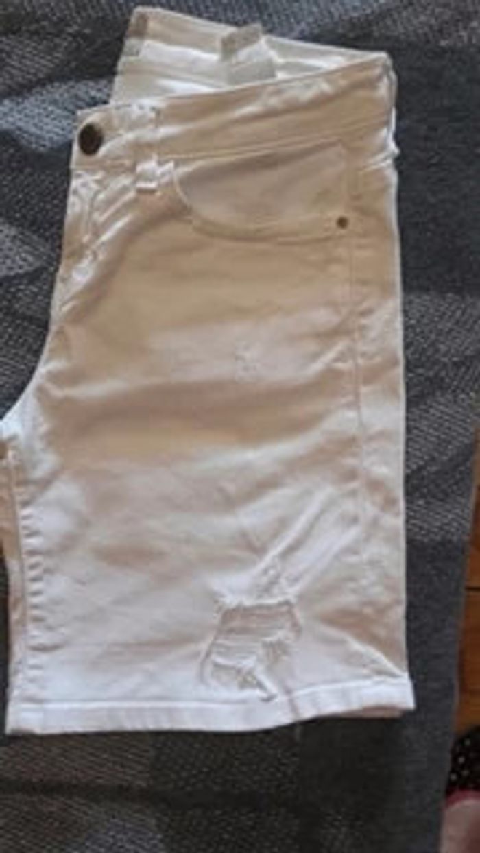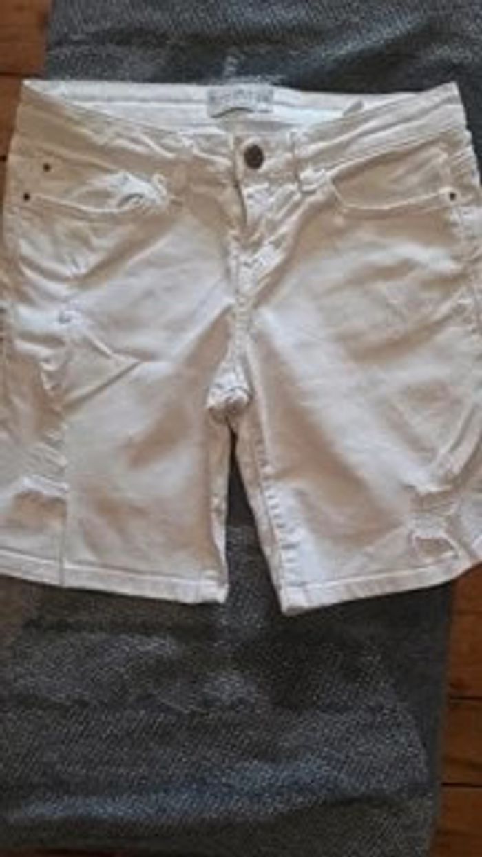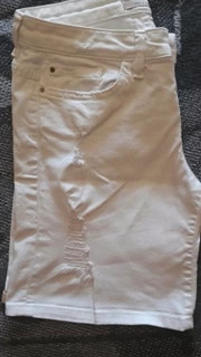 Joli short en jeans blanc En parfait état 98 % coton et 2 % élasthanne Effet déchiré, très à la mode 2 poches devant et 2 poches à l'arrière Se ferme par un bouton et une fermeture Eclair Taille 34 correspond à du XS #vêtementsfemmeXSeilsel0 #pantalonfemmeT34eilsel0