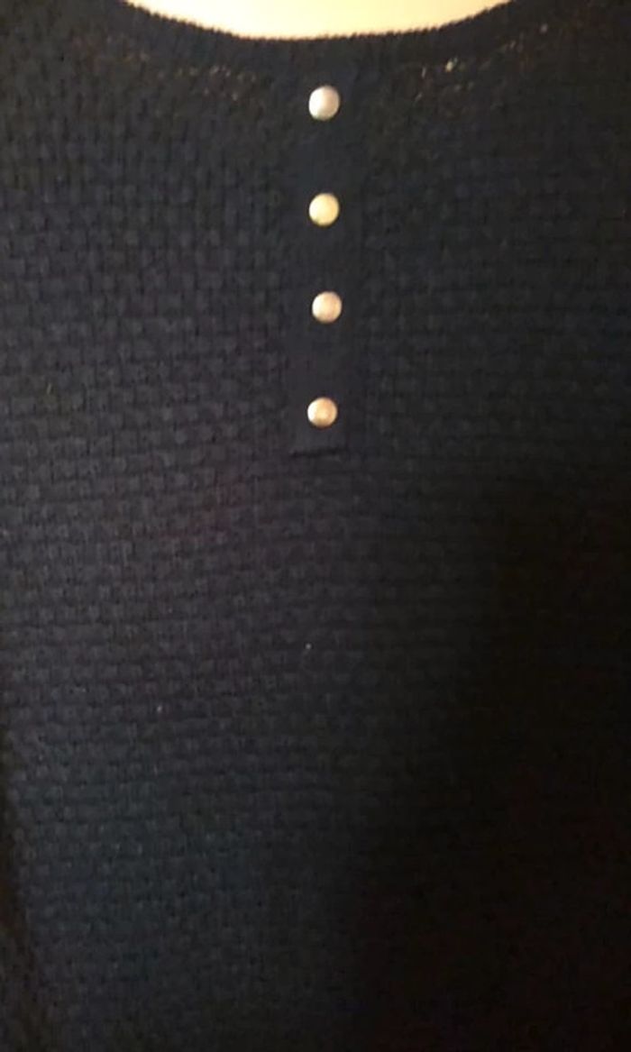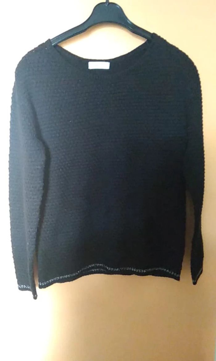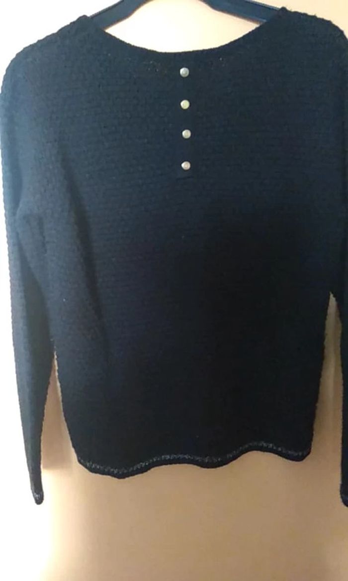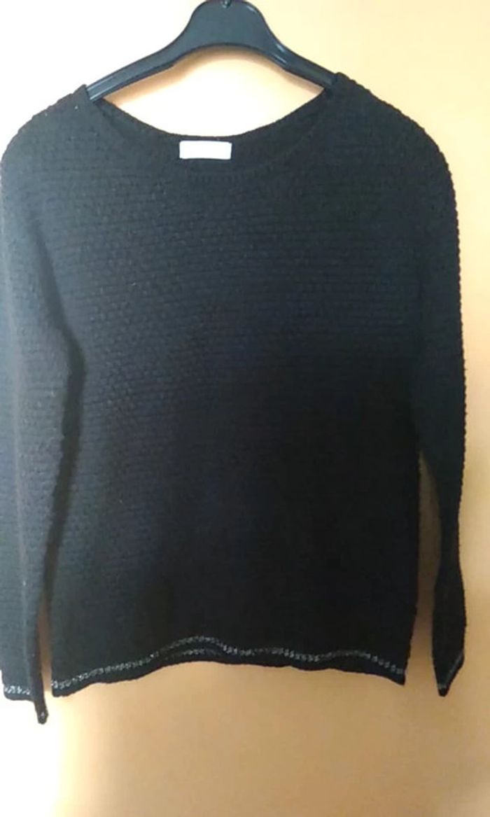 Magnifique pull noir avec liseré argenté (fil métallisé) à la base et aux manches En parfait état car très peu porté Col rond 4 petits boutons dorés agrémentent le dos de ce pull 98 % acrylique, 1 % polyester et 1 % fil métallisé Taille XS correspond à une taille 34 #hautfemmeT34eilsel0 #vêtementsfemmeXSeilsel0