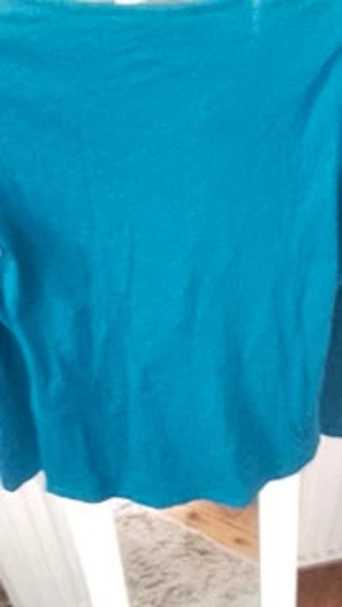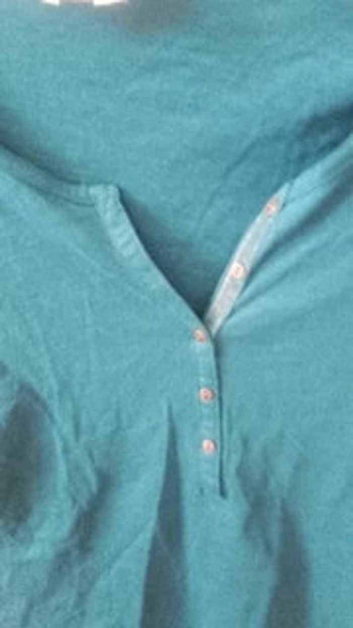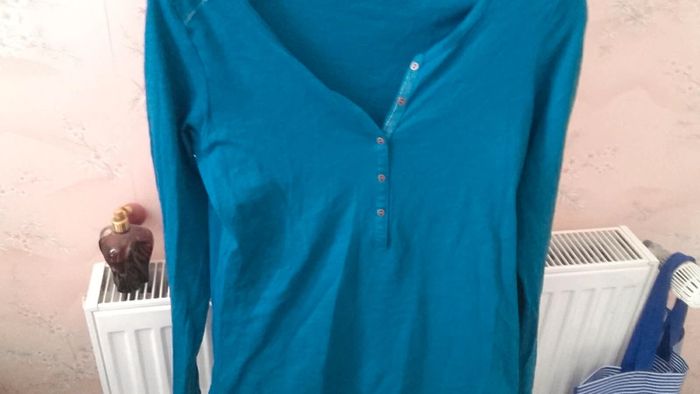 Tee-shirt à manches longues NEUF car jamais porté Coloris défini comme vert canard (entre vert et bleu selon notre vue) 100 % coton Col V avec liseré et petits boutons Les manches peuvent être remontées et attachées #vêtementsfemmeXSeilsel0 #articlesneufseilsel0