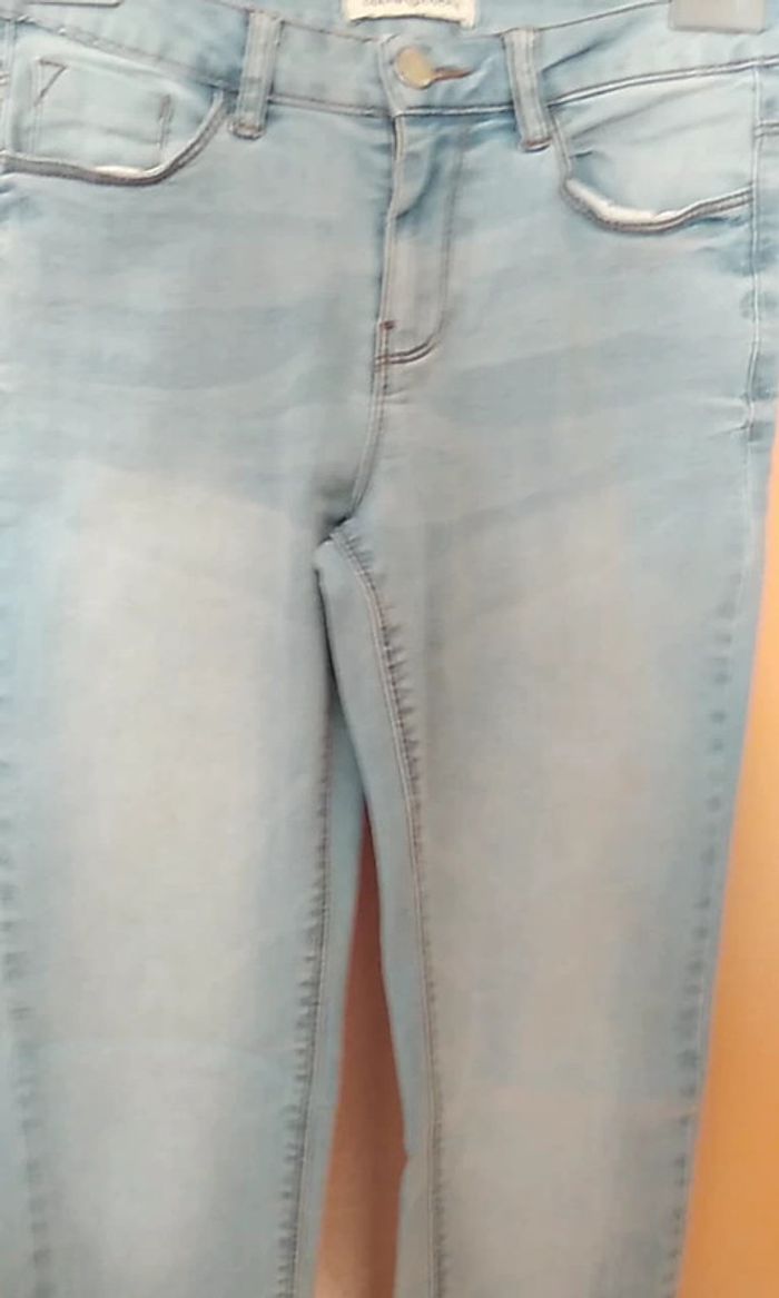 Jeans en très bon état Bleu clair Se ferme par un bouton et une fermeture Eclair 1 poche de chaque côté devant 1 poche de chaque côté derrière 63 % coton - 24 % polyester - 10 % viscose et 3 % élasthanne #pantalonfemmeT34eilsel0