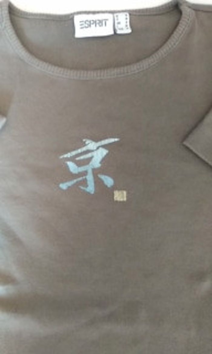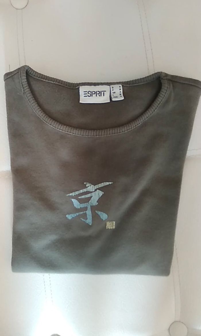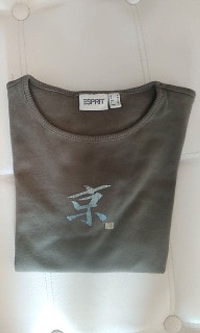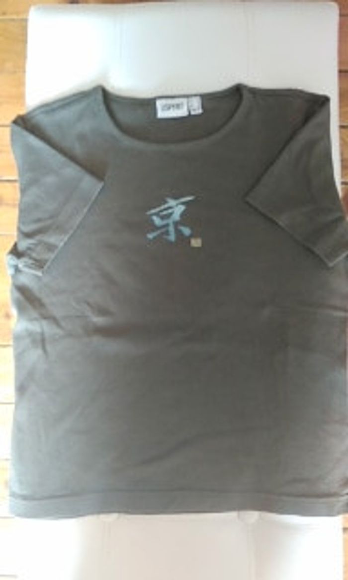 Tee-shirt kaki avec motif bleu clair à manches courtes Col rond En parfait état 100 % coton Taille M correspond à une taille 38 #hautfemmet38eilsel0