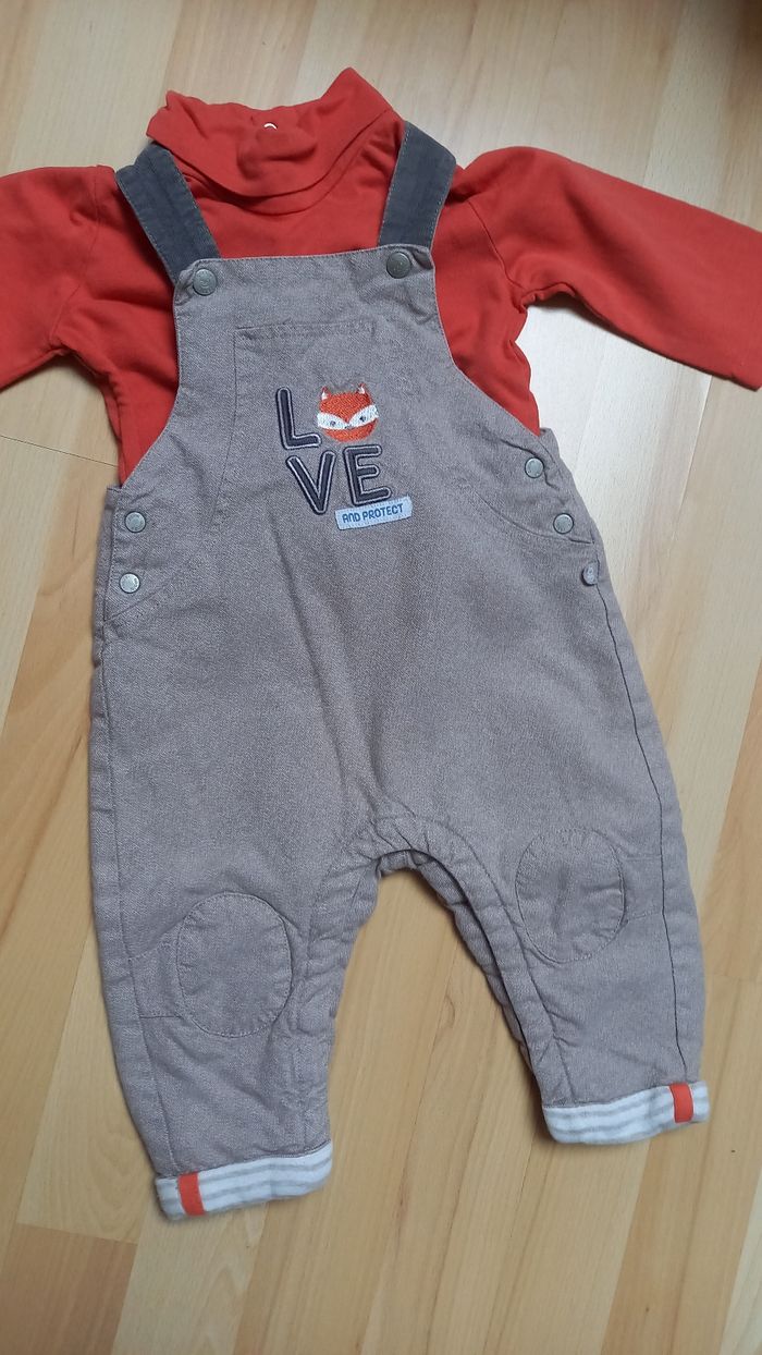 GARÇON 9 MOIS N°397 Ensemble 2 pieces Taille 9 mois -sous pull , orange Pression au dos 100% coton Tape a l oeil -salopette marron / beige Renard Pression bretelle , entre jambes 100% coton Obaibi 6,50€ #kelly_garçon9mois