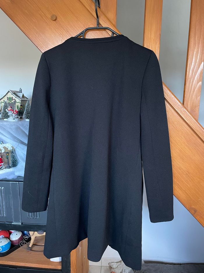 FEMME 36 / S N°1432 Long blazer noir Gauffré , fausse poche Longueur 84 cm Taille 36 / s Tissu 1 , 95% polyester, 5% elasthane Doublure 100% polyester Lady blush 12€ #kelly_femmeT36