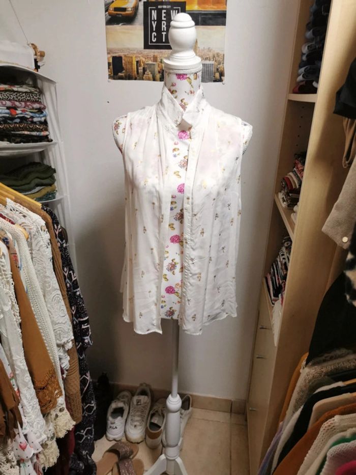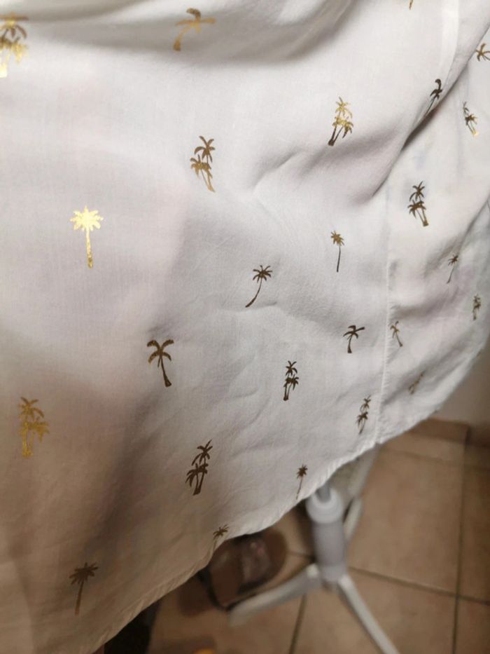 Vend chemise blanche légère (un peu transparente) Motif palmier 🌴 dorée Elle est neuve (je sais même pas pourquoi je l'est acheter d'ailleurs) Taille: 38 (M)