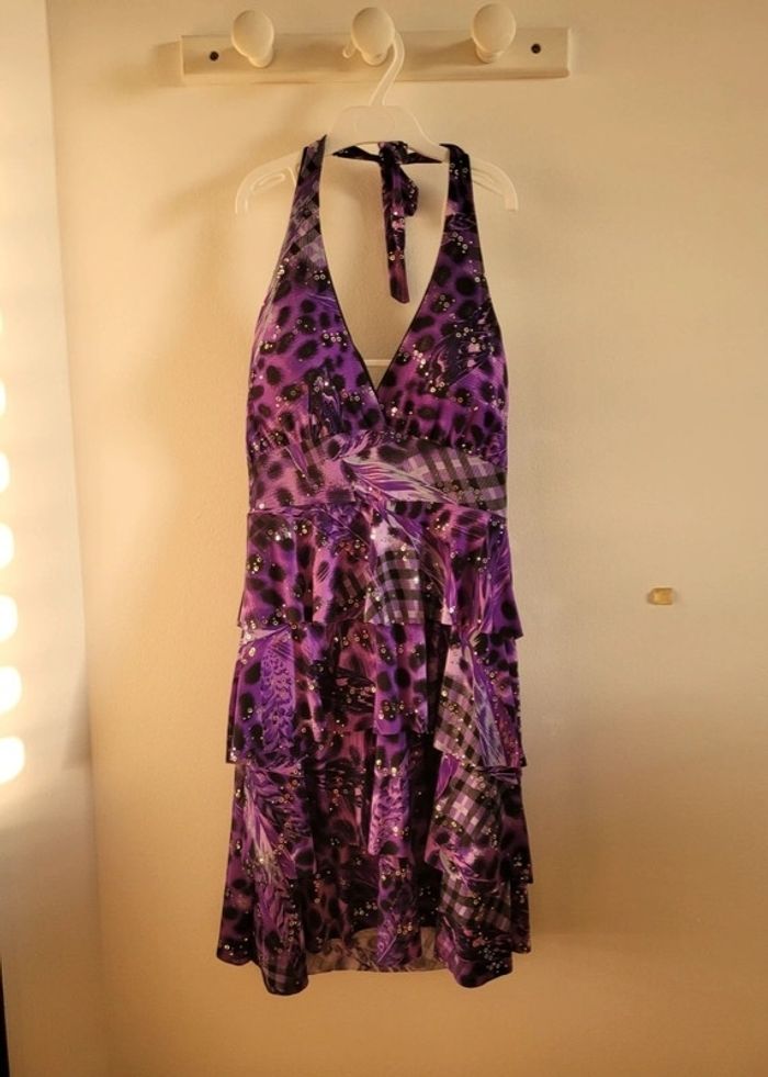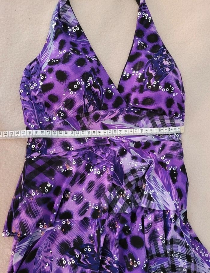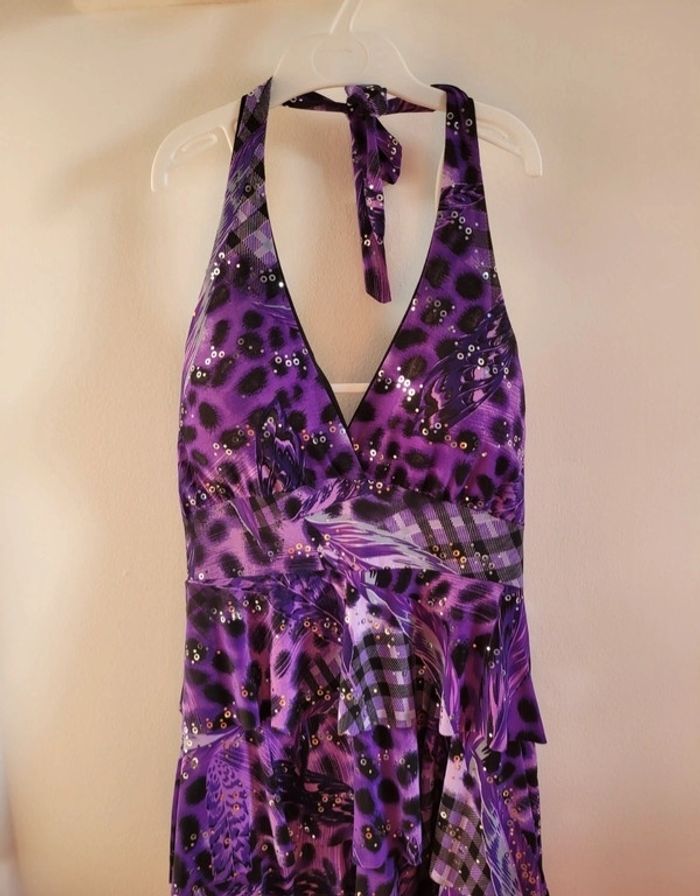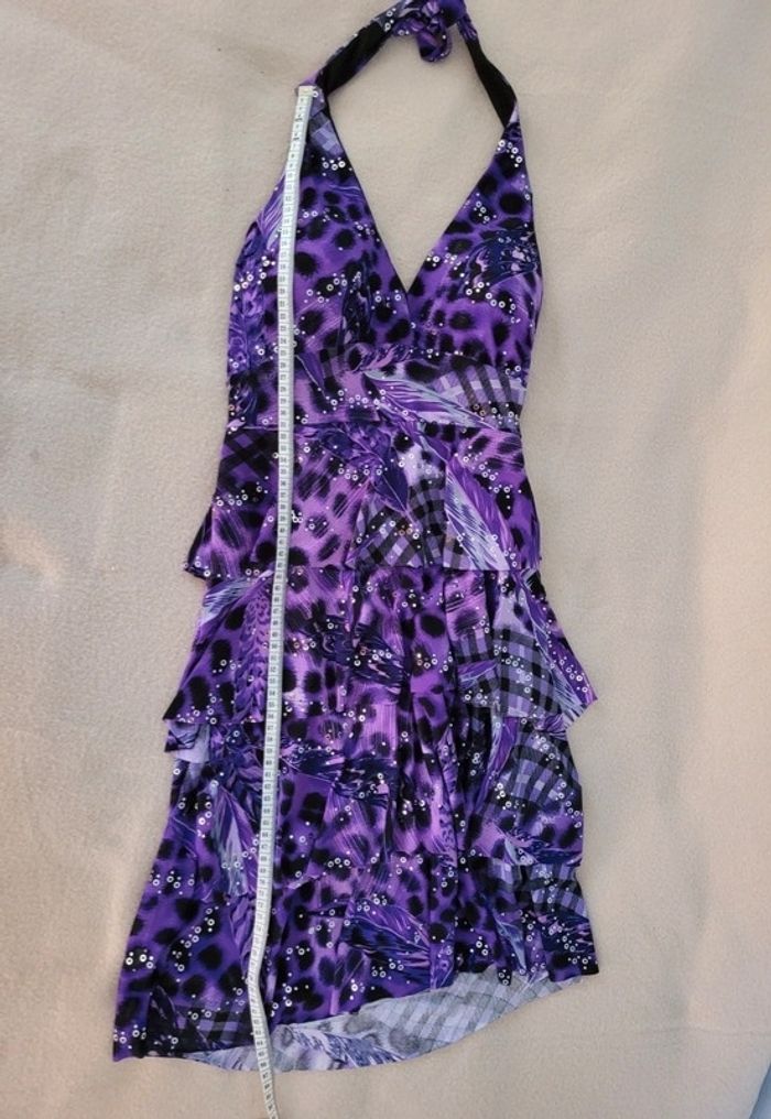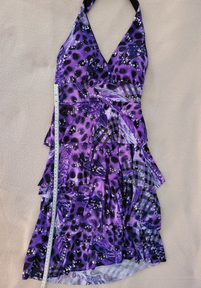 Robe chic dos nu TU En très bon état peu porté Violet et noir avec paillettes argentée Taille unique, s'adapte grâce au dos élastique et au nœud de la nuque Longueur sous poitrine 60 cm Longueur totale 84 cm Largeur taille environ 31 cm Poitrine doublée qui ne nécessite pas de porter un soutien gorge
