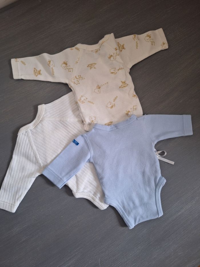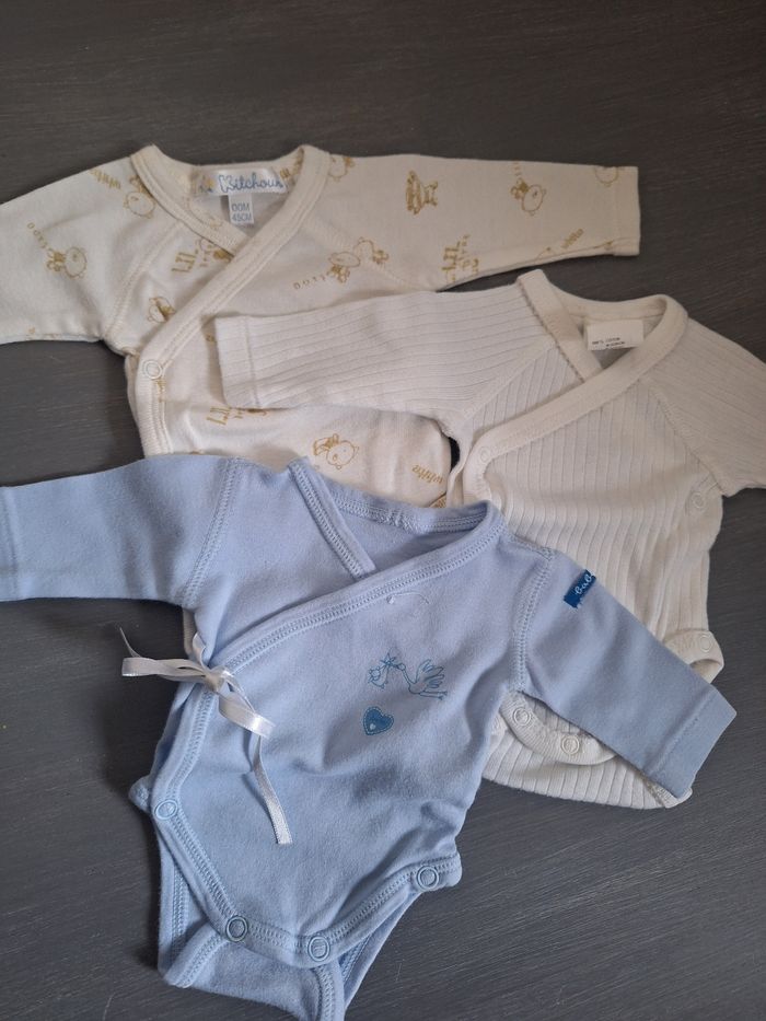 GARÇON PRÉMA N°52 lot de 3 bodies Taille 00 , préma - bleu ciel Fermeture cache cœur, lacet 100% coton - blanc Pression brassière Envog - blanc Imprimé Pression brassière 100% coton Kitchoun 5€ #kelly_garçonprématuré