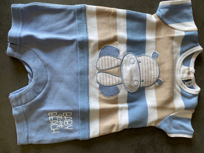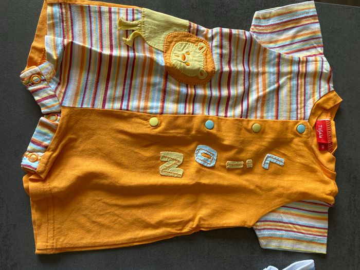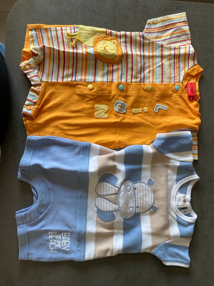 body garçon, taille 1 mois, très bon état, aucunes taches, marque Tissaia pour le lion et marque Intermarché pour l’hippopotame