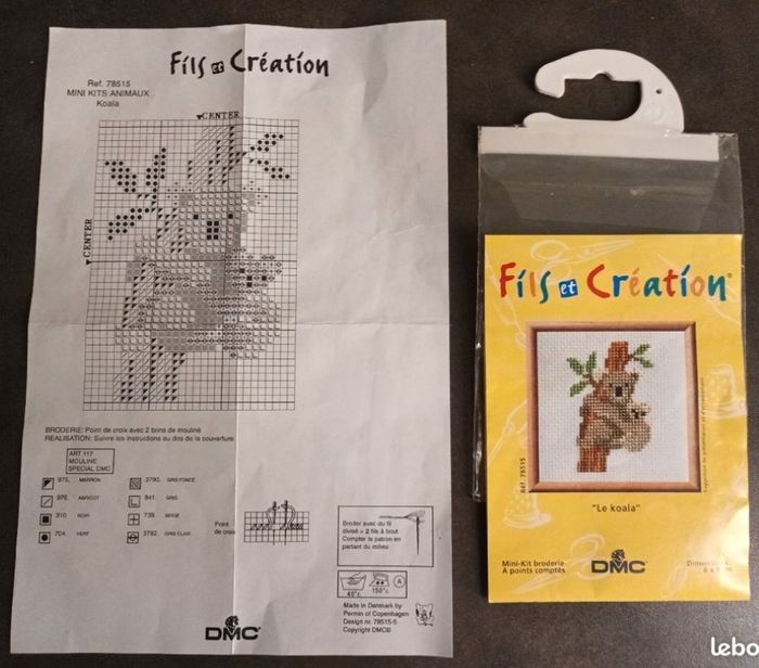 Modèle koala en point de croix DMC Je viens de le réaliser (cf dernière photo) et il reste encore du fils pour le faire une autres fois : - fil marron : reste 8 brins de mouliné (4 utilisés) - fil abricot : reste 8 brins de mouliné (4 utilisés) - fil noir : reste 4 brins de mouliné (2 utilisés) - fil vert : reste 4 brins de mouliné (2 utilises) - fil gris foncé : reste 14 brins de mouliné (4 utilisés) - fil gris : reste 10 brins de mouliné (8 utilisés) - fil beige : reste 4 brins de mouliné (2 utilisés) - fil gris clair : reste 8 brins de mouliné ( 4 utilisés) Pas de toile fournie par contre (et modèle réalisé en dernière photo que je garde)
