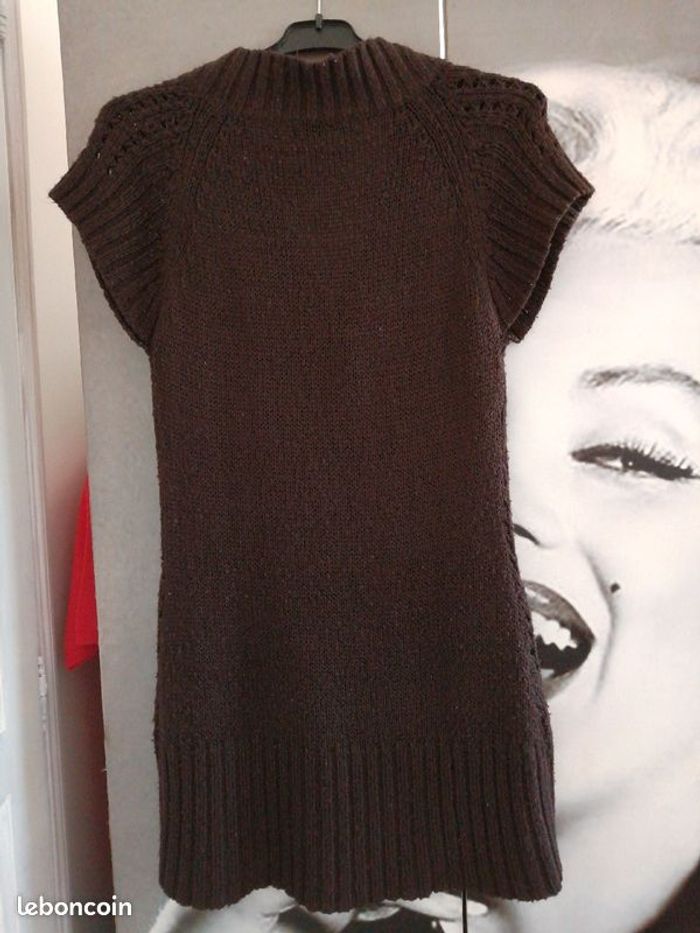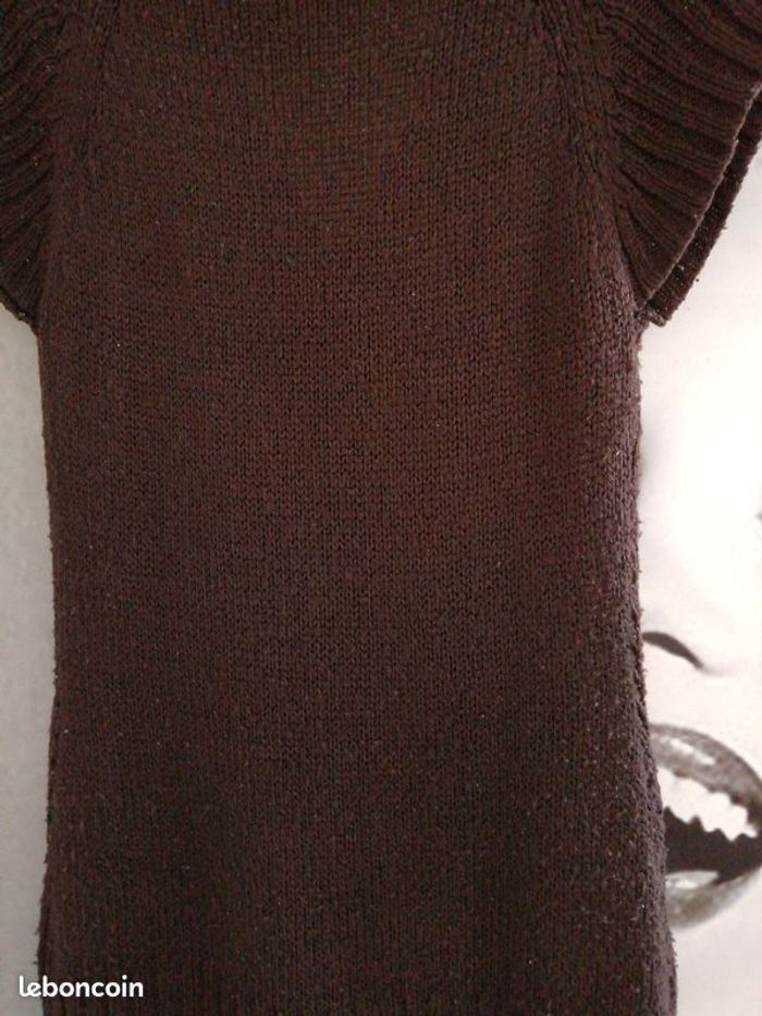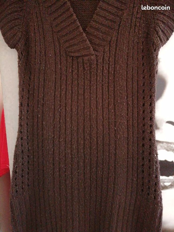 Robe pull marron manches courtes et col en V à souvent était portée mais reste dans état correct