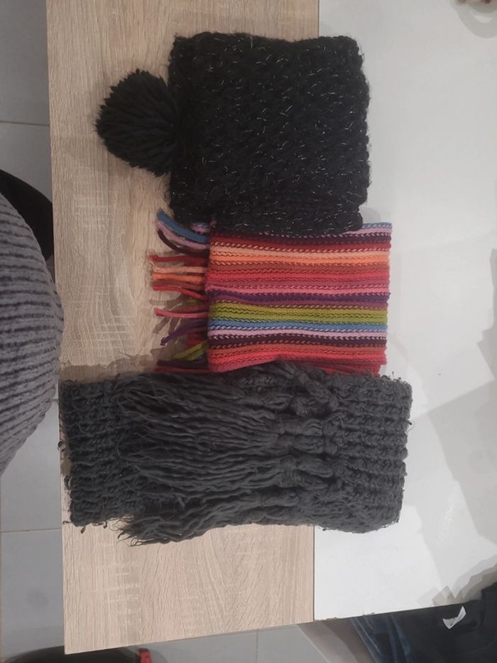 Lot de trois écharpes. Il manque un pompon sur la noire. Bon état, différentes traces d'usures 1,50 l'unité ou 3 euros le lot
