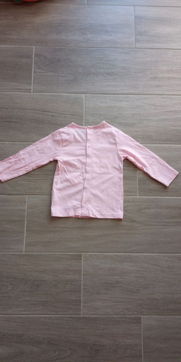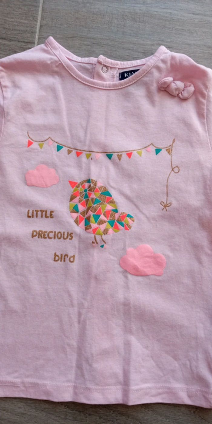 T-shirt manches longues 18 mois - 77-82 cm 11kg rose avec effet paillettes dorées. Marque Kiabi. Ouverture complété par pression dans le dos. #kiabifille #kiabi #doré #oiseau