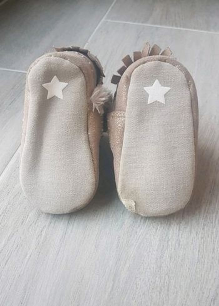 Bottines indiennes à franges fourrées et pailletées or TAO. Fermeture à scratch. Taille 6 mois. Bon état général hormis un coin du dessous de la chaussure gauche râpé (voir photo) #bottines #bottinesfourrées #tapealoeil #tapealoeilfille