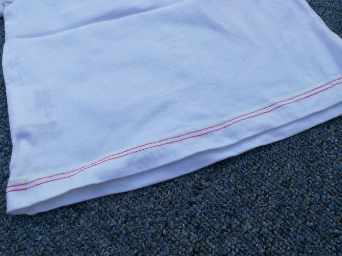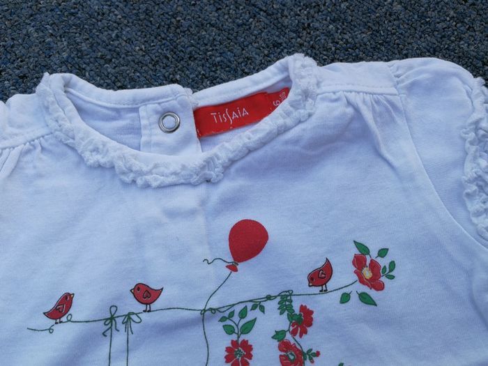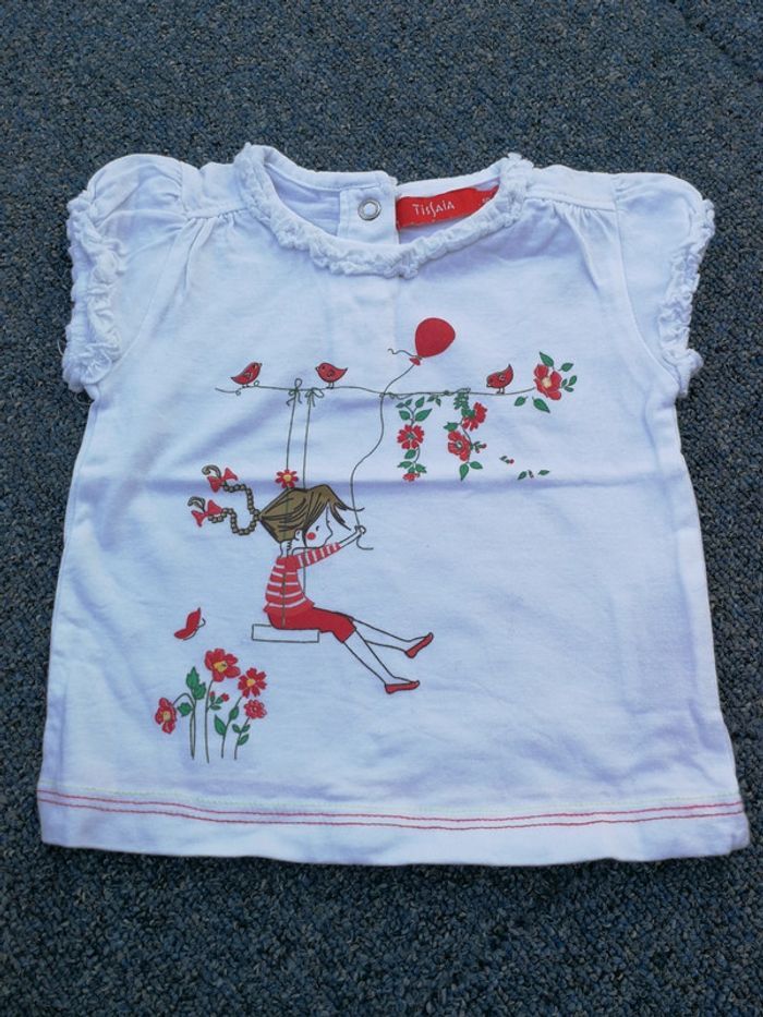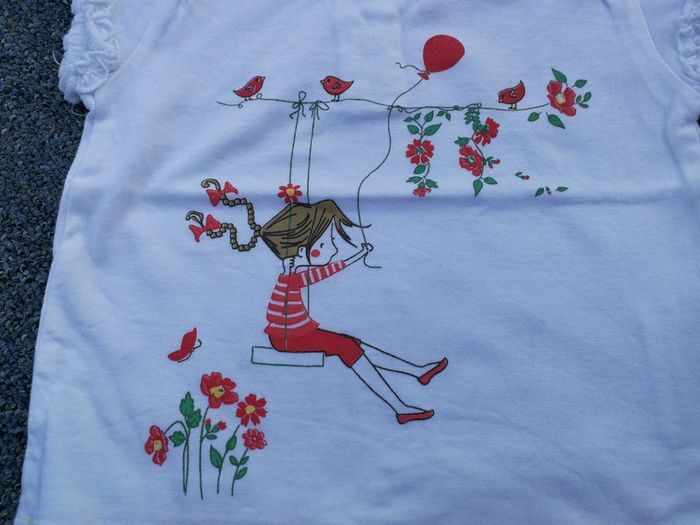 Tshirt manches courtes, blanc avec motif petite fille sur balançoire, ballon, fleurs, marsye Tissaia, 6 mois. Boutons pressions dans le dos + bordure rouge sur le bas. Bon état #6moismowglie12 #6moisfillemowglie12