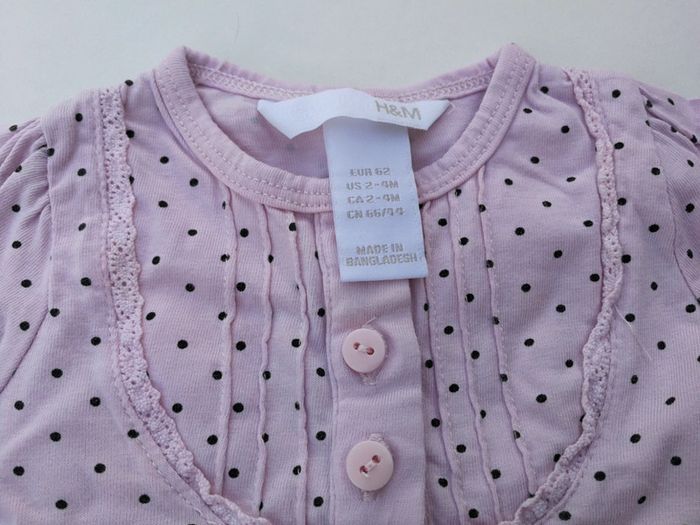Tshirt manches longues, rose à pois, boutons devant, marque H&M, 2- 4 mois (taille grand, plutôt 6 mois) Bon état #3moismowglie12 #3moisfillemowglie12 #6moismowglie12 #6moisfillemowglie12