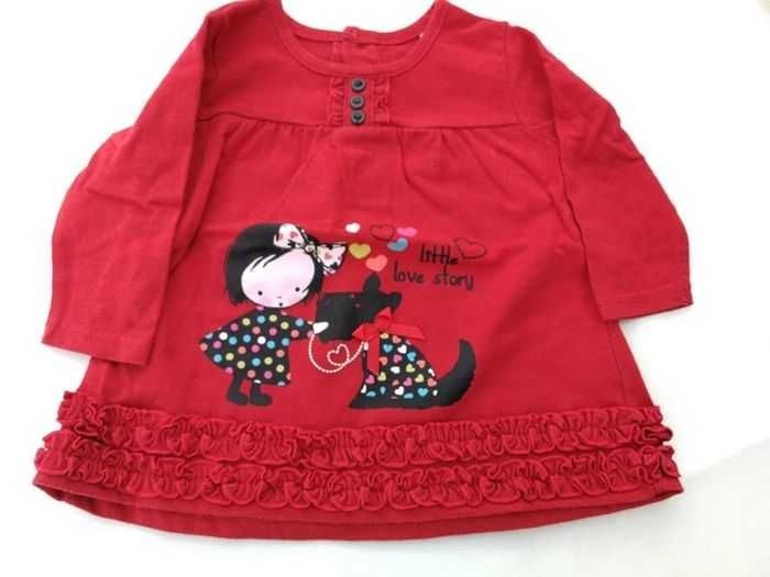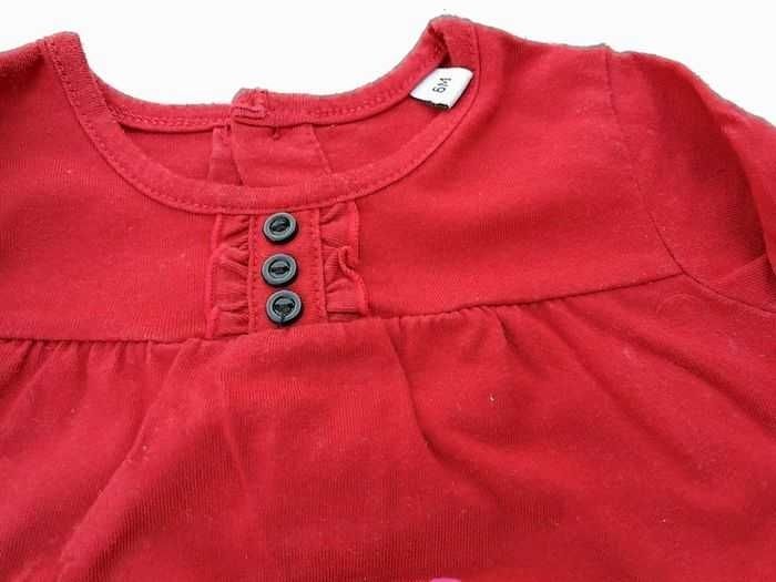 Tshirt /blouse, manches longues, rouge avec petite fille et chien, boutons dans le dos et décoration froufrou sur le bas, taille 6 mois Bon etat #6moismowglie12 #6moisfillemowglie12