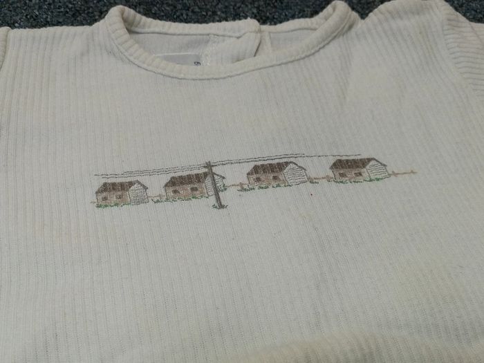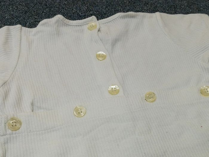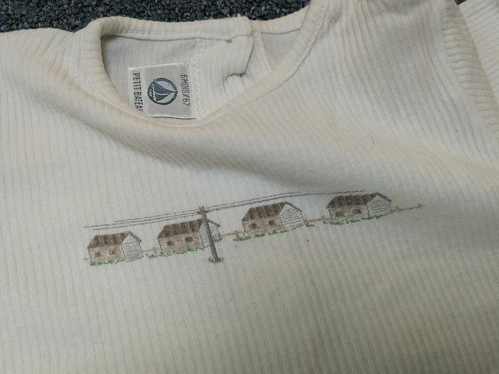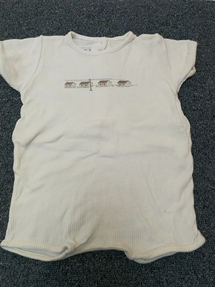Combishort blanc rainuré avec 4 maisons, ouverture par boutons dans le dos, marqur Petits Bateau, 6 mois / 67 cm. Bon état #6moismowglie12 #6moisfillemowglie12 #6moisgarconmowglie12