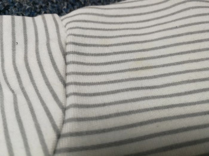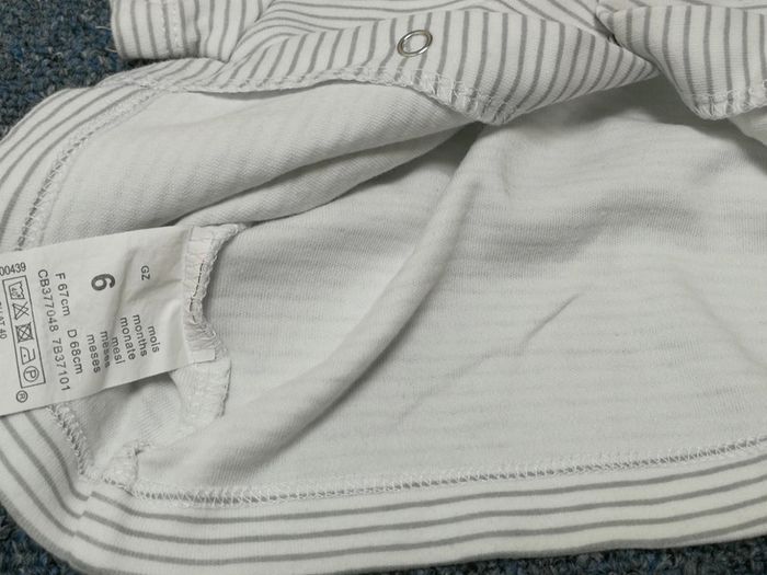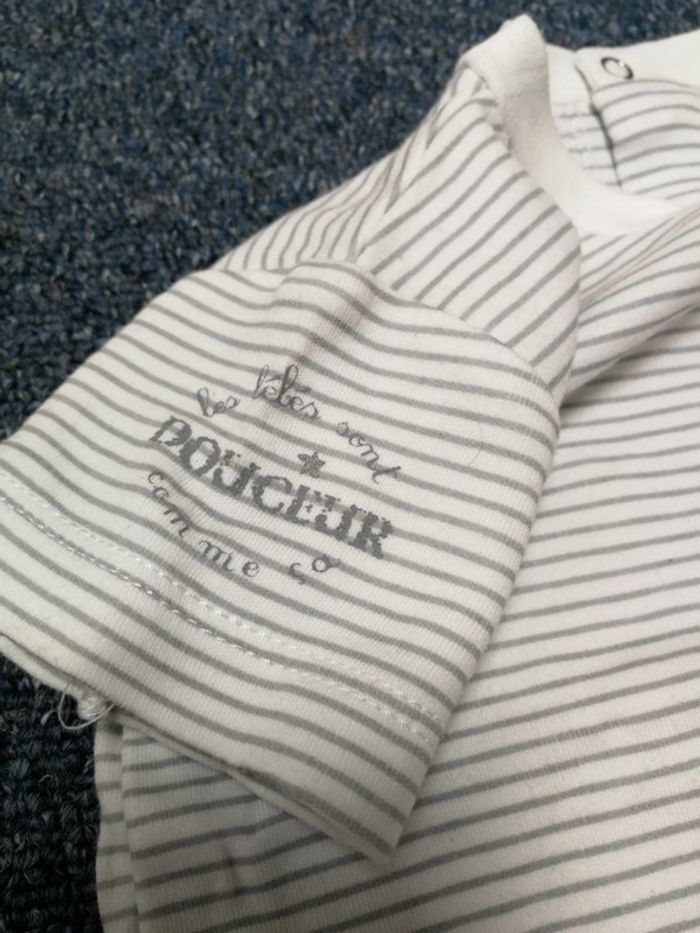 Tshirt manches longues courtes, rayé blanc et gris avec ouverture par boutons pression dans le dos, inscrit sur le bras "DOUCEUR les bébés sont comme ça", 6 mois / 67 cm. 100%coton. Etat satisfaisant, un petit sur le bras devant et une petite tache dans le dos, cf photos. #6moismowglie12 #6moisgarconmowglie12
