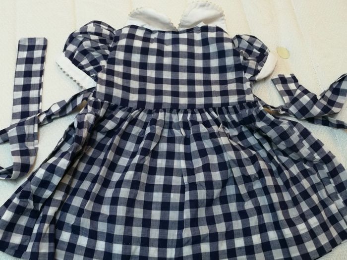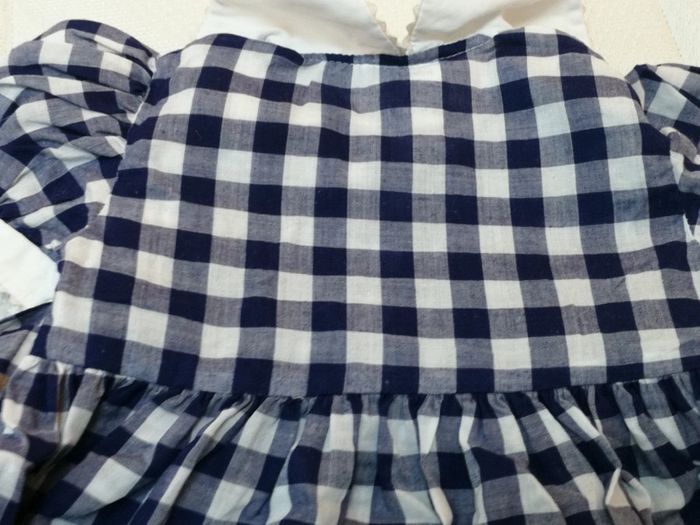 Robe à carreaux blanc et bleu avec col, fermeture par boutons devant, noeud dans le dos. Marque bout'chou (monoprix), taille 6 mois / 67 cm. Bon état #6moismowglie12 #6moisfillemowglie12