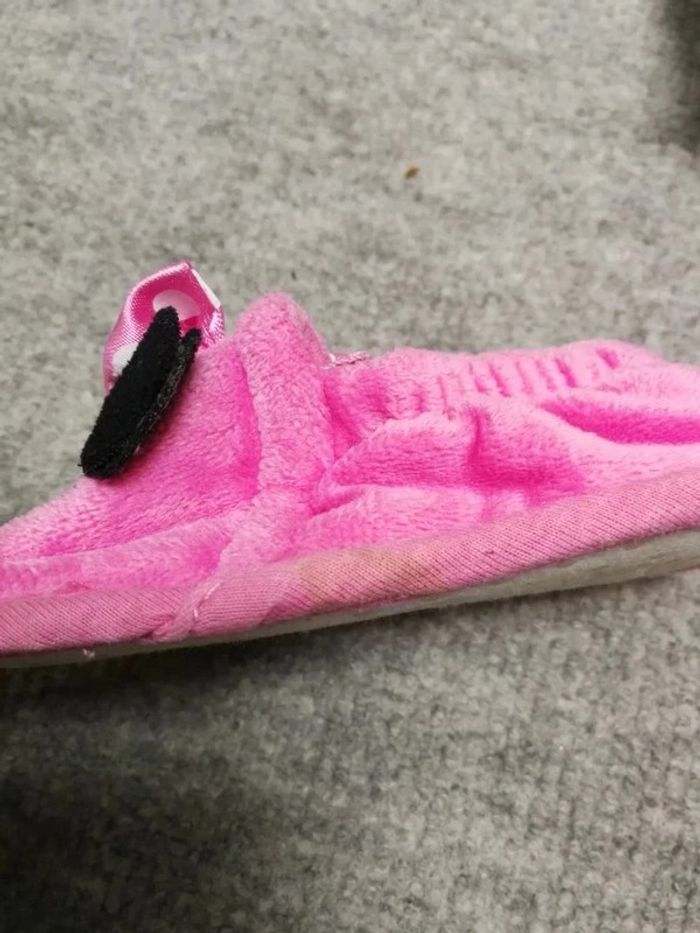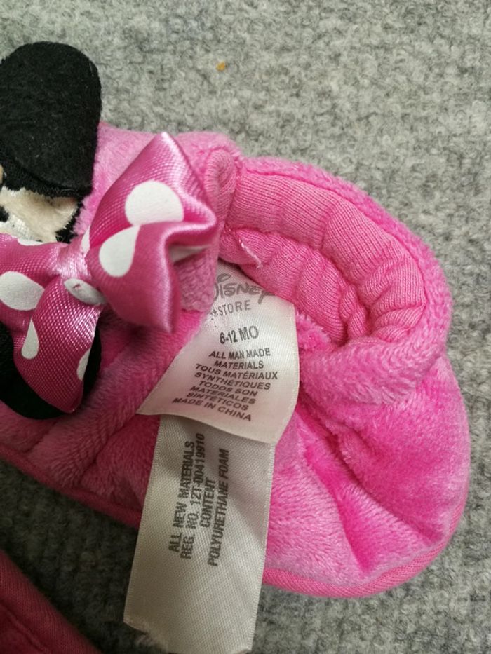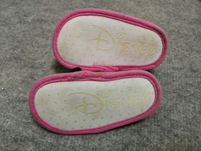 Chaussons rose Disney, avec tête de Minnie. Pour l'intérieur. Taille 6 - 12 mois (environ 19 selon moi). Très bon état, peu servi. Une tache sur le coté de la semelle, cf photo. #chaussurefillemowglie12 #accessoirebébémowglie12