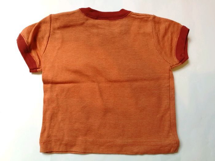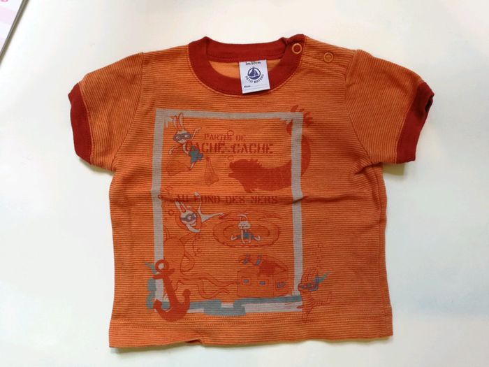 T-shirt orange, manches courtes, 60 cm, "une partie de cache cache au fond de la mer". Peu porté. #3moismowglie12 #3moisgarconmowglie12