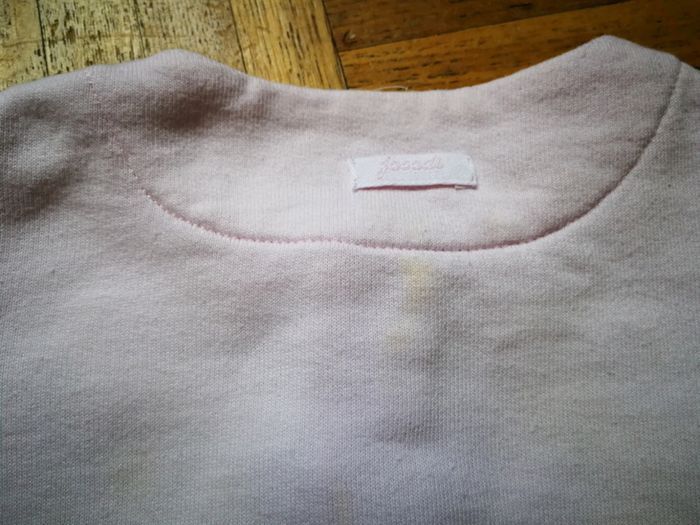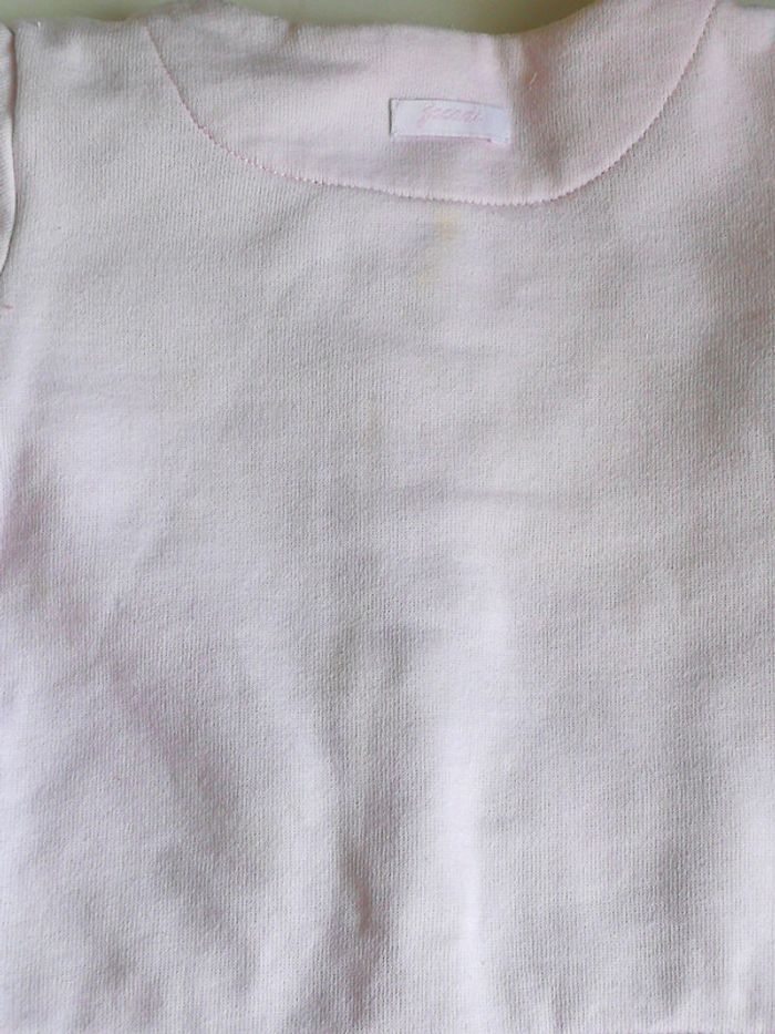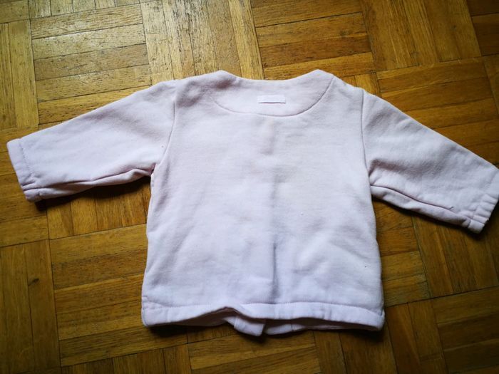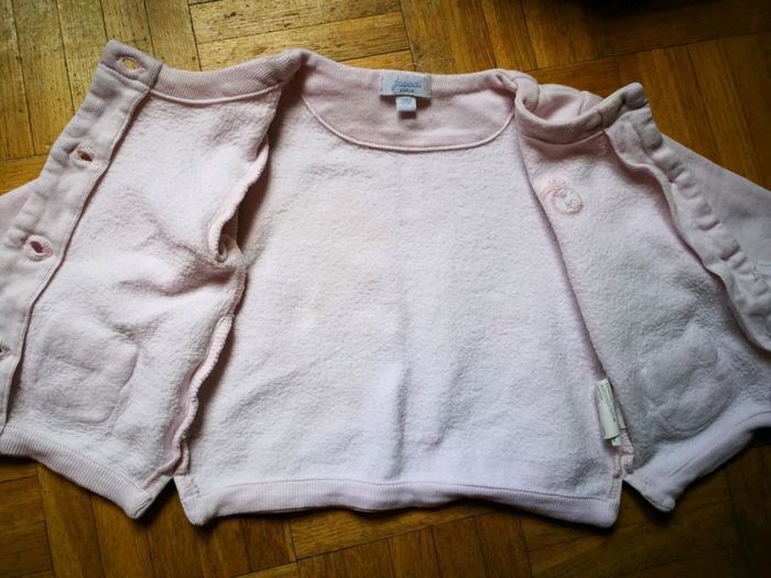Veste / gilet rose clair. Des taches jaunes au dos, cf photos #3moismowglie12 #3moisfillemowglie12