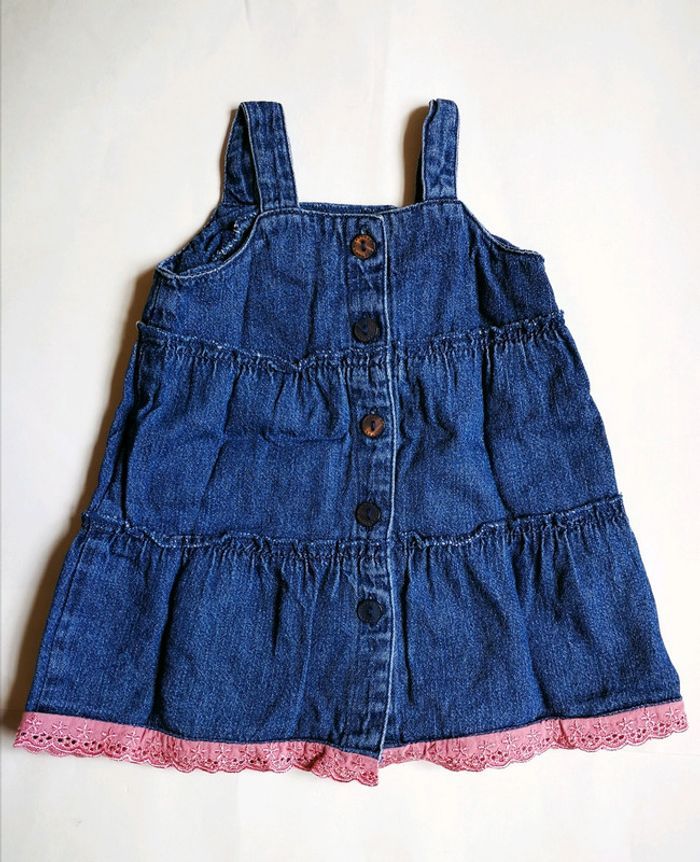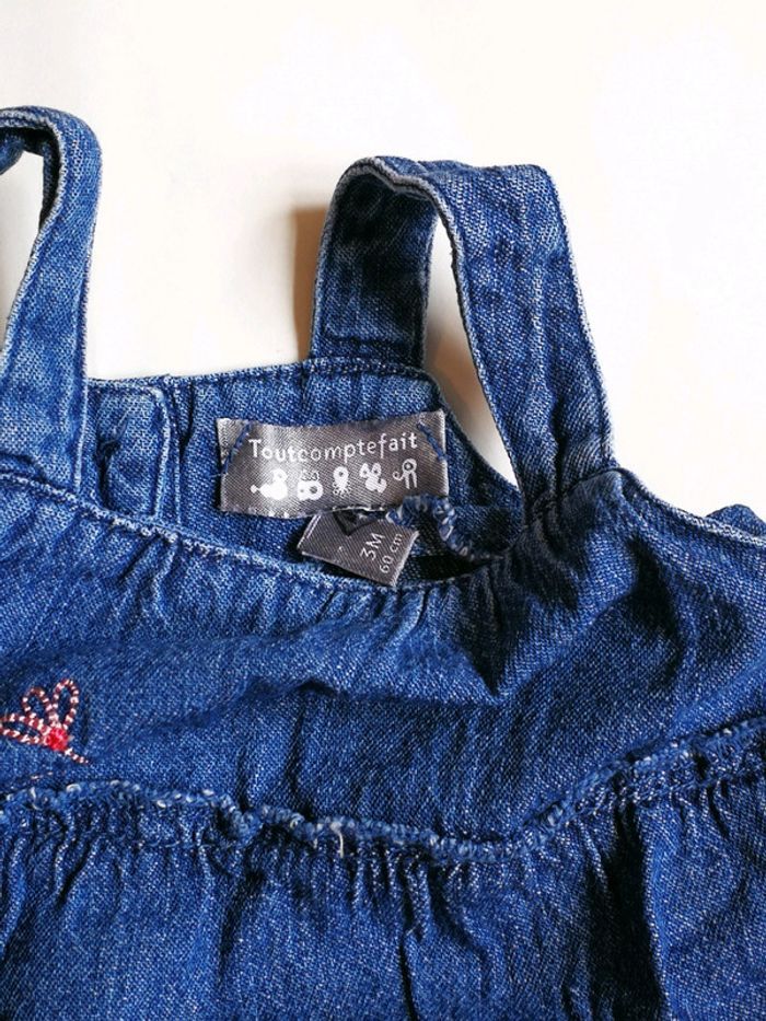 Robe bleu en jeans avec une bordure rose, a bretelles et fermeture dans le dos. 60 cm. #3moismowglie12 #3moisfillemowglie12