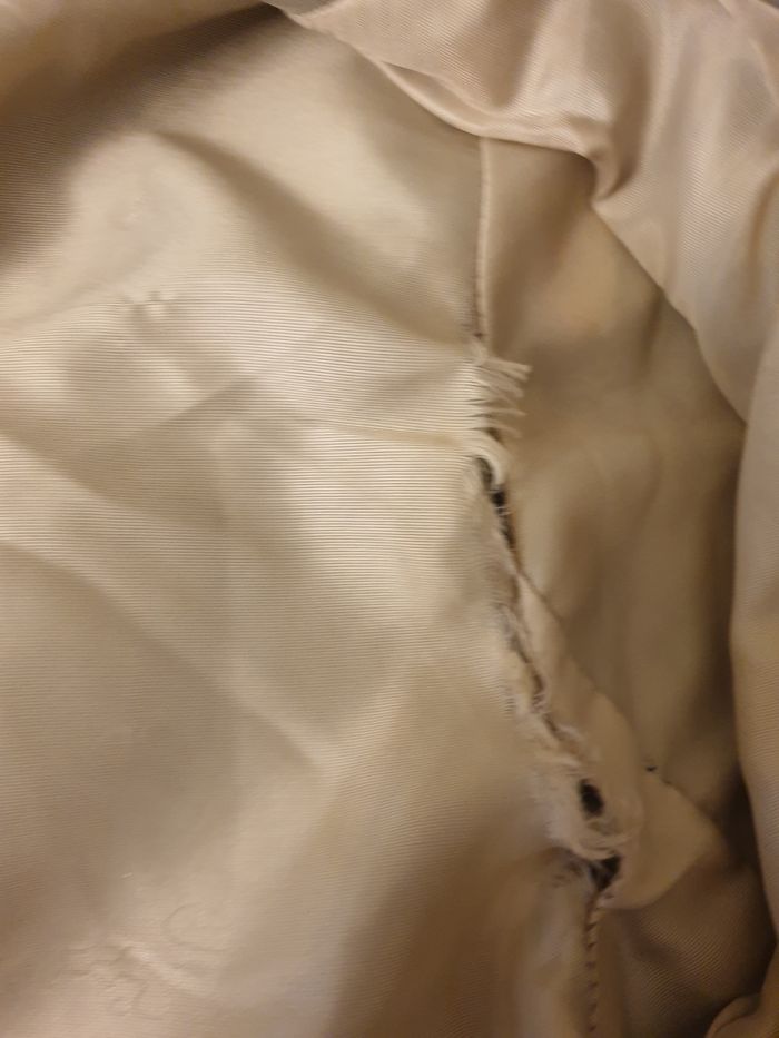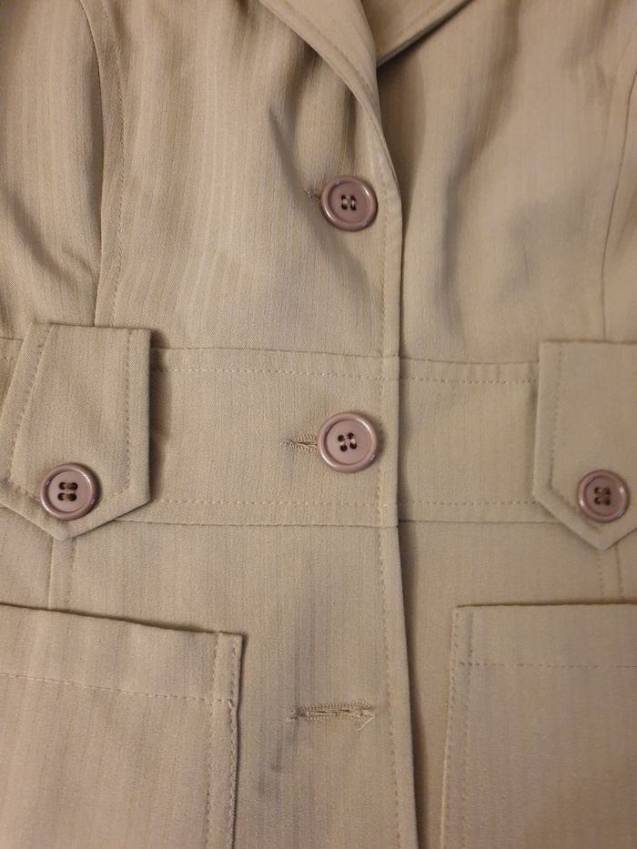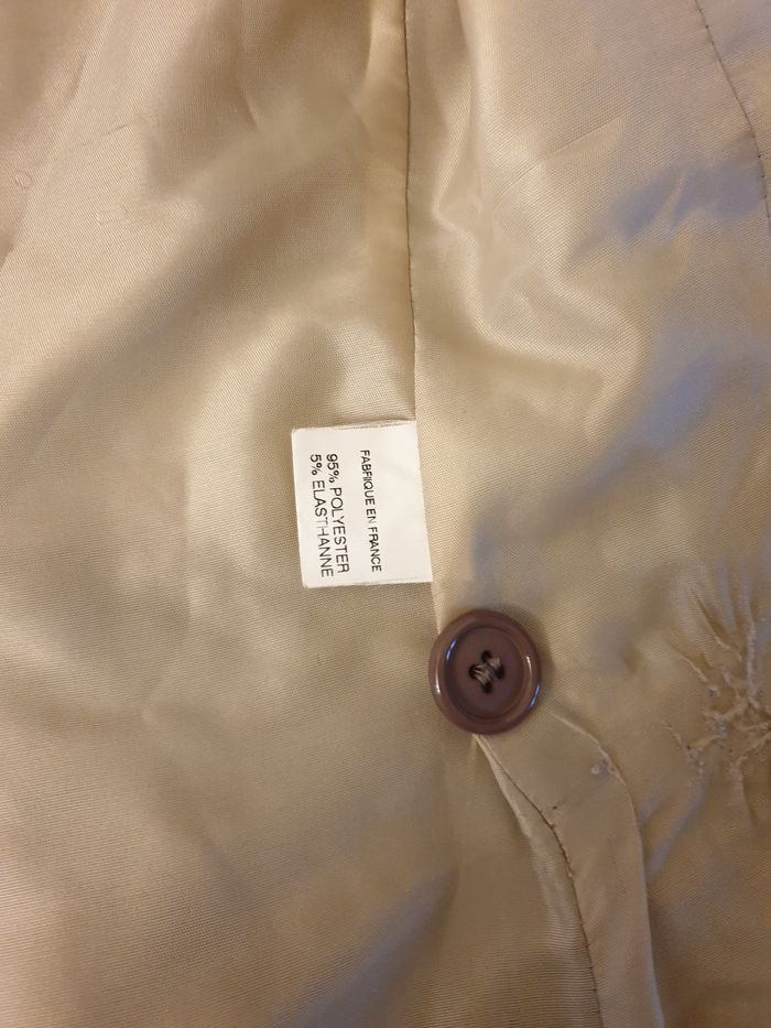 Veste kaki, doublée, en bon état général. Pecca – taille 36 Fabriquée en France 95 % Polyester 5 % Élasthanne Il manque un bouton, mais il y en a un de rechange à l’intérieur de la veste. La doublure est déchirée au niveau du bras gauche (voir photo). Dimensions prises à plat (peuvent varier de quelques millimètres) Largeur épaules : 39 cm Largeur emmanchures : 46 cm Hauteur : 66 cm Longueur manches : dessus 63 cm – Dessous 44 cm Envoi rapide et soigné