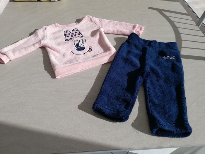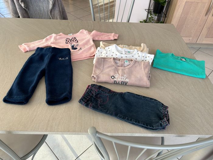 Un lot composé de: - un pull vert Cyrillus - un ensemble Disney tout doux - 3 pyjamas velours 2 de marque Tex et un de Disney Baby - un jean petit cœur - un pull vert Cyrillus offert un sarouel rouge le lot de 7 pièces 10€ soit 1,42€ la pièce