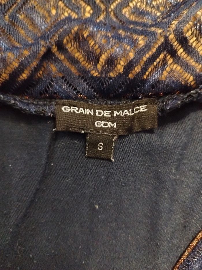 T-shirt bleu marine à liseré doré, en bon état de la marque Grain de Malice, en taille S. Le tissu est un peu marqué au niveau de la taille de la ceinture. N'hésitez pas à faire des lots 🌱