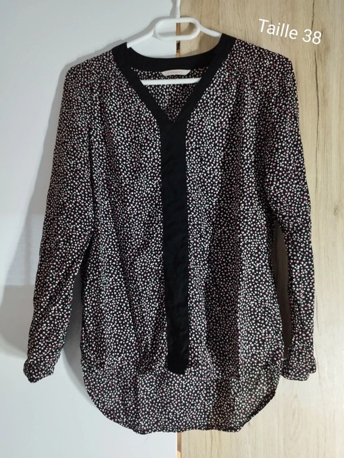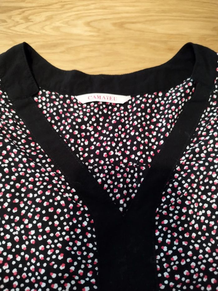 Blouse à manches longues à motifs noir, blanc et rose de la marque Camaïeu, en taille 38. N'hésitez pas à faire des lots 🌱