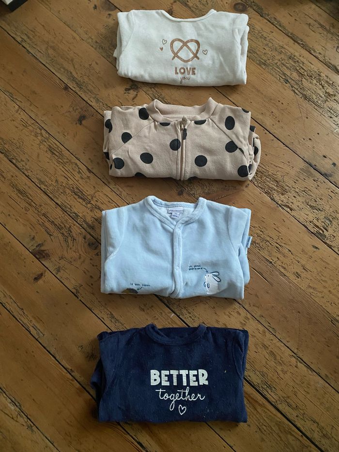 Lot de 4 pyjamas, taille 3 mois. De marques Kiabi, H&M et P’ti bisou
