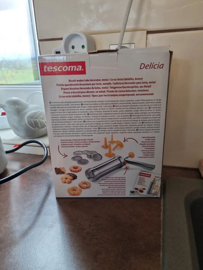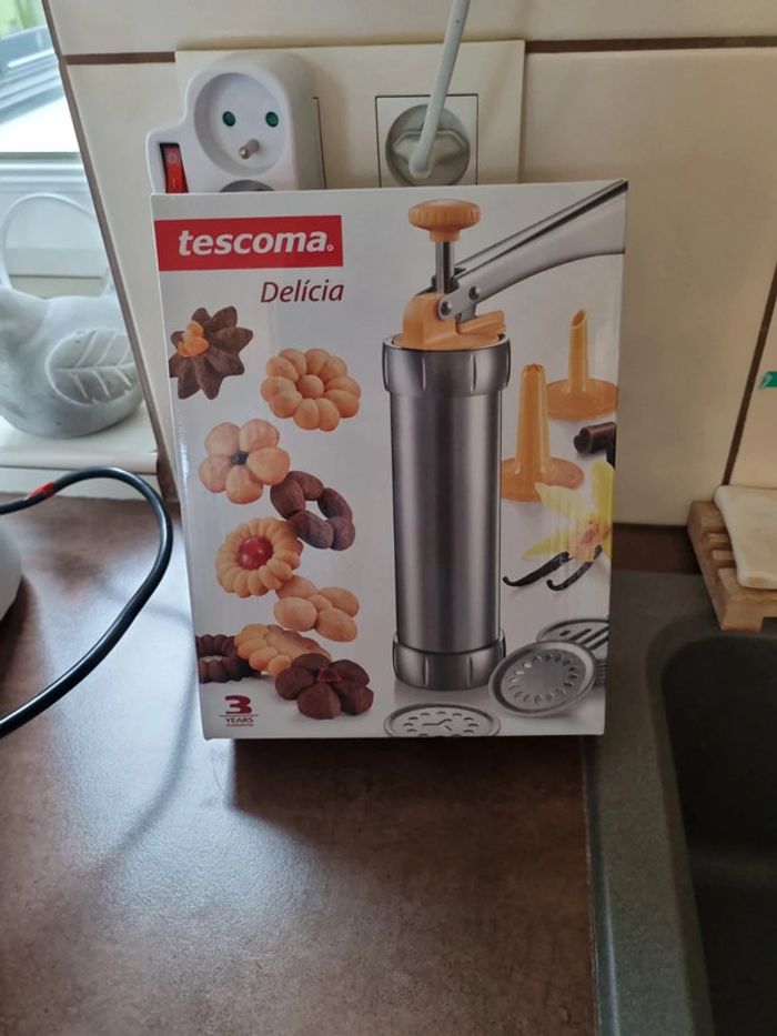 Presse à biscuits Marque Tescoma Neuf Excellente pour la préparation de biscuits salés et sucrés, pour décorer les gâteaux, amuse-gueule, plats, etc... Fournie avec 10 matrices et 6 embouts à décorer. Fabriquée en matière plastique à haute résistance, peut être nettoyée au lave-vaisselle. 3 ans de garantie. Mode d'emploi et recettes dans l'emballage.