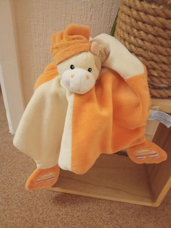 Doudou mouchoir , carré, motif girafe gipsy orange, jaune , mixte, pattes, étiquette - photo numéro 3