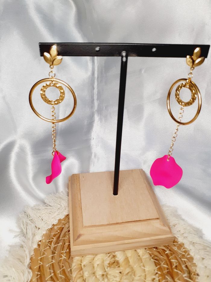 🌸 Boucles d'oreilles fait-main en acier inoxydable doré. 🌸 Pétale de fleurs : rose vif. 🌸 Longueur totale ( fermoir compris): environ 9.5 cm.