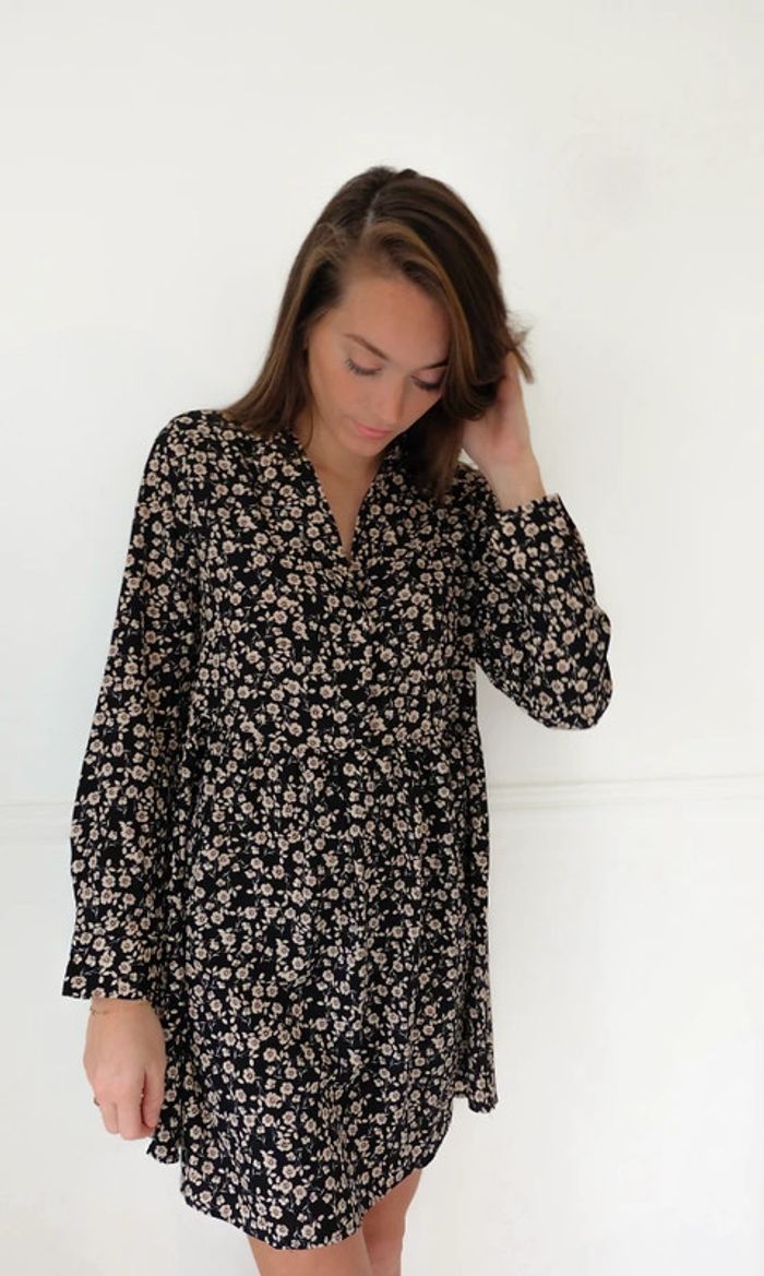 🌟 Robe noir et beige à fleurs manches longues - photo numéro 1
