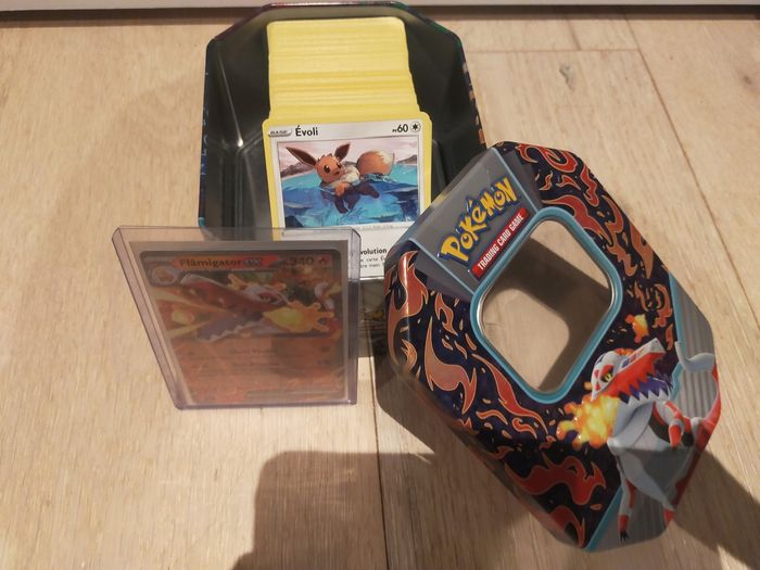 Lot de minimum 200 cartes Pokémon fr ,communes ,peu communes, rares,qlq énergies,qlq doubles ,un ex sous protection dans une jolie pokebox