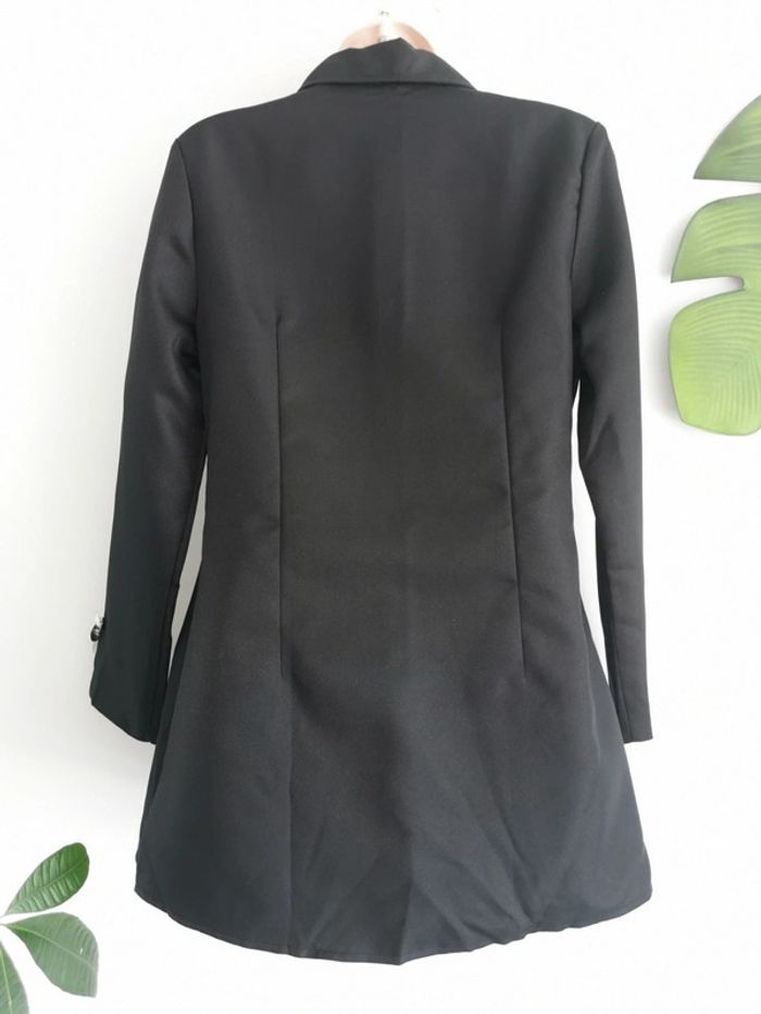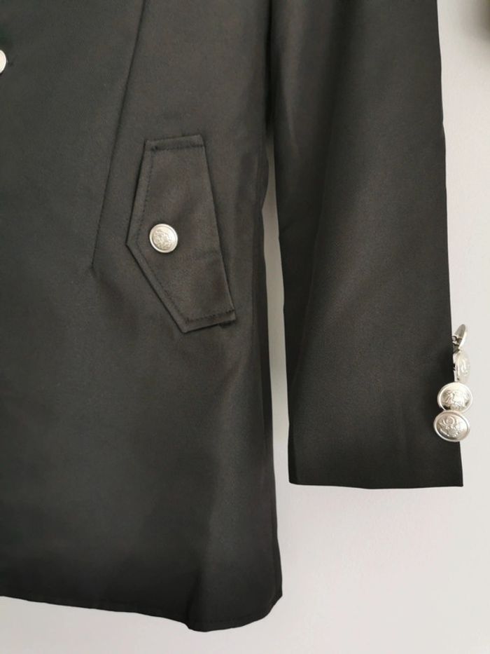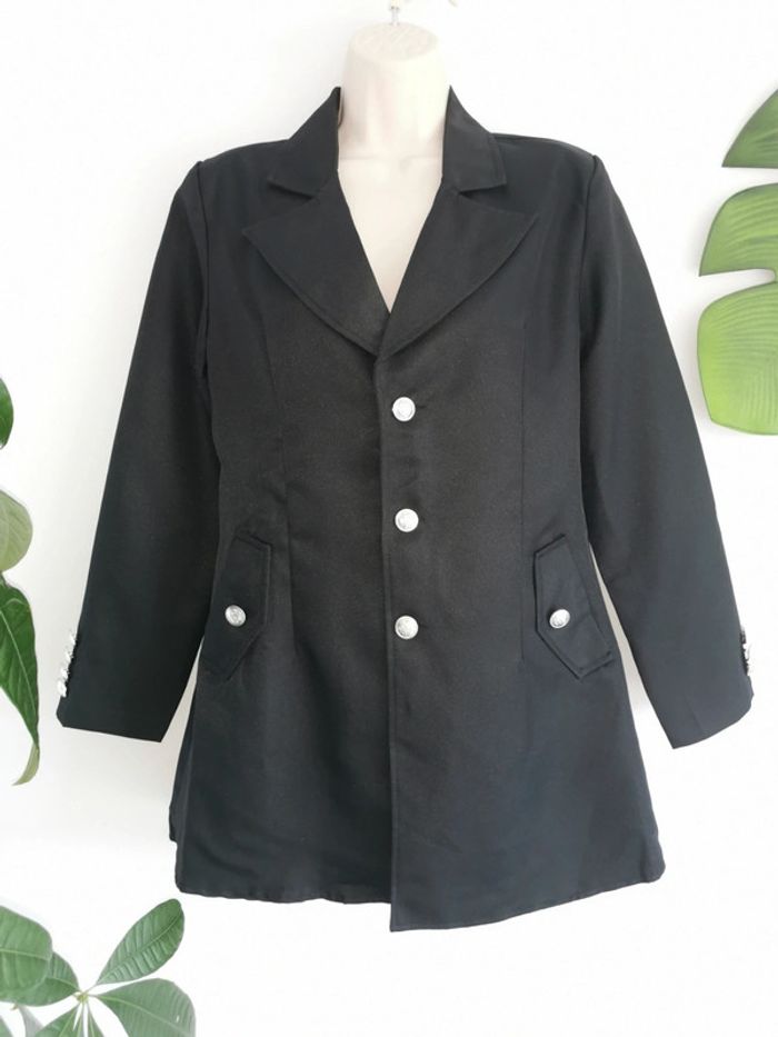 🧥 ARTICLE NEUF SANS ÉTIQUETTE 🧥 Blazer 🧥 noir ⚫ 🙎‍♀️ Taille L Tissu noir ⚫ légèrement brillant Coupe cintrée Fermeture par 3 boutons argentés Col à revers Manches longues avec boutons decoratifs argentés 2 poches à l'avant Présence d'épaulettes 📏 Mesure épaules: 38 cm 📏 Mesure sous aisselles: 49 cm 📏 Longueur: 76 cm Parfait état👌, jamais porté #SoStyLifemmeTailleL 🌫️
