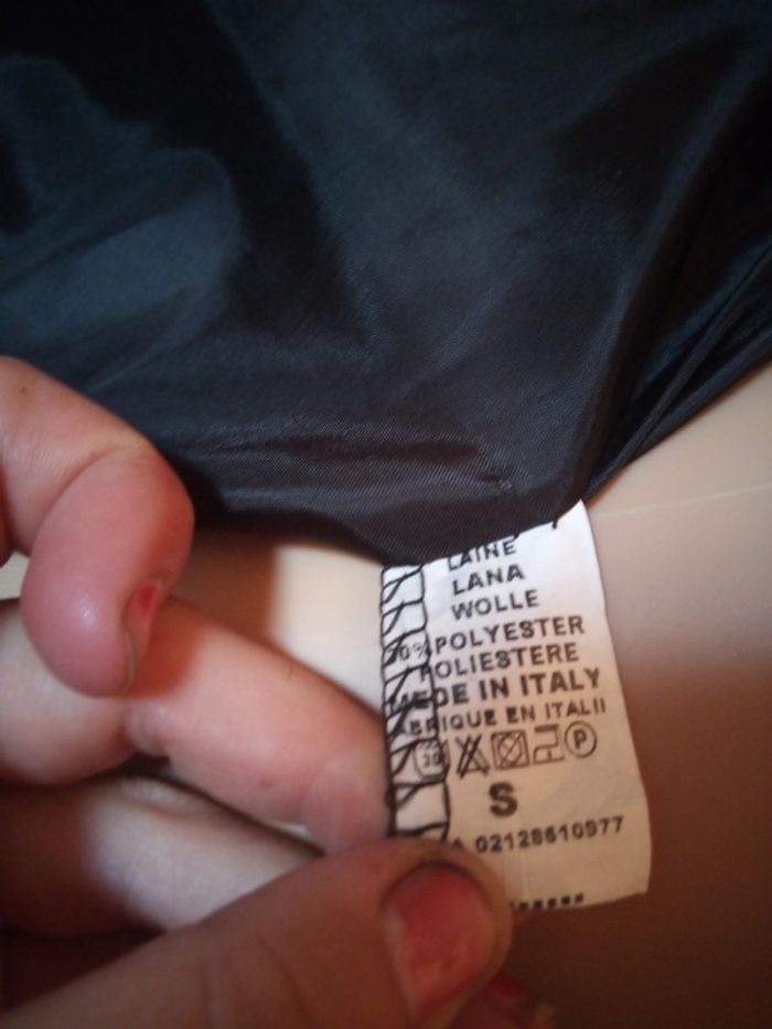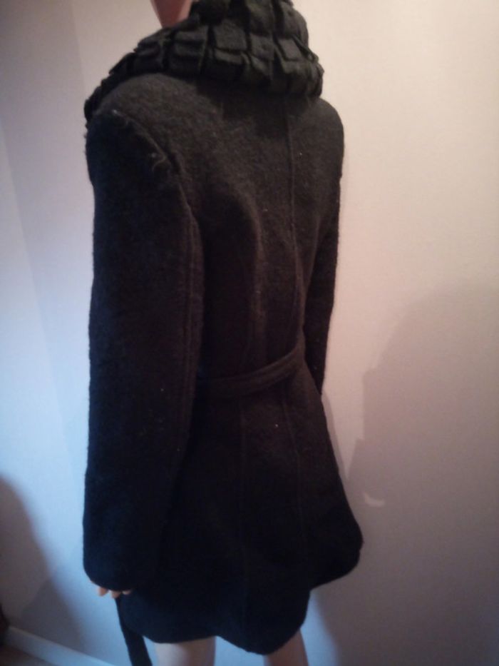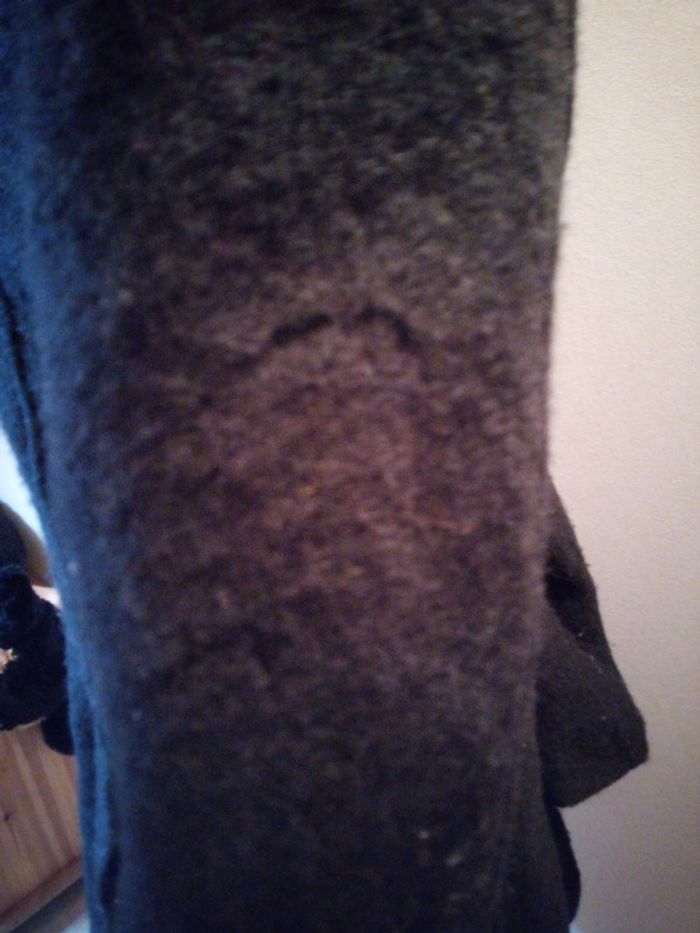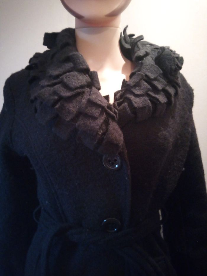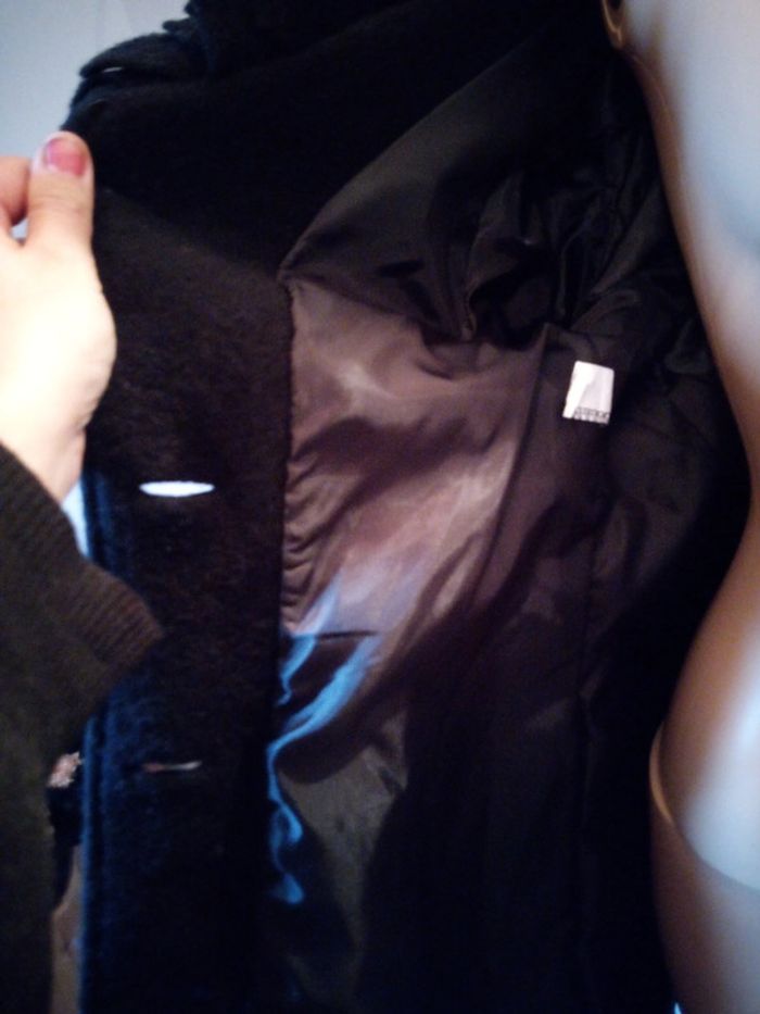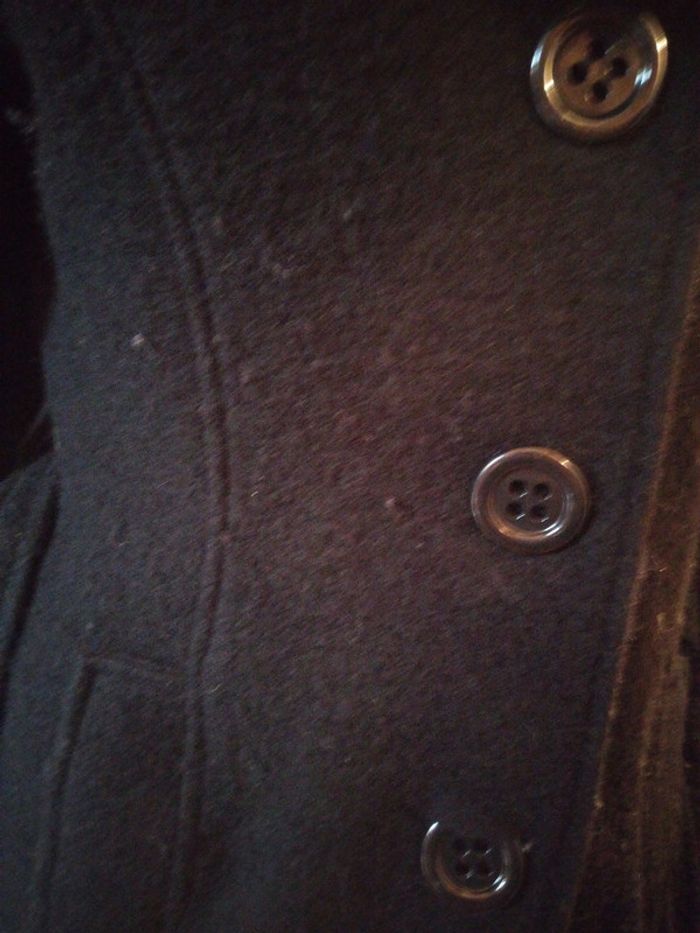 Bonjour vend veste noir se ferme avec des boutons et une ceinture accro sur une manche ( photo a l'appui les dernières) et bouloche un peu mais sa s'enlève a la main