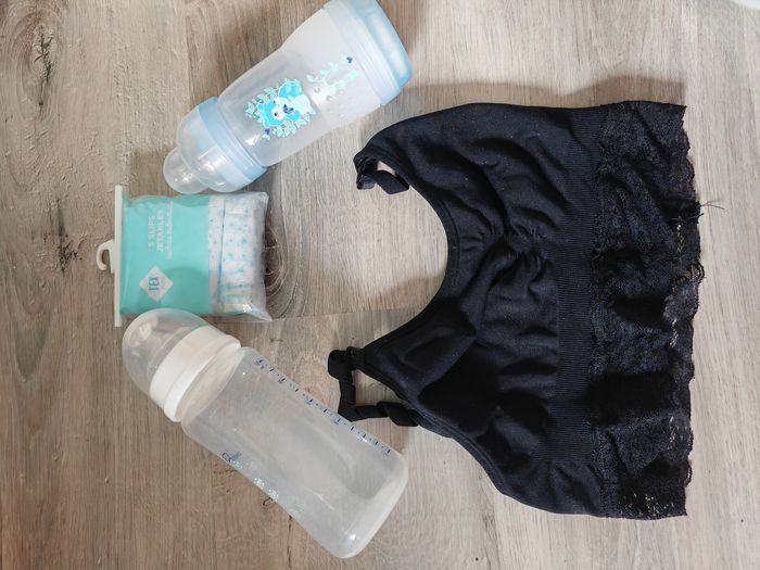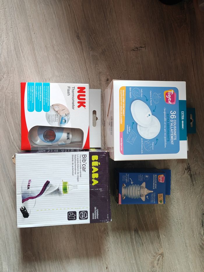 Divers articles (chaussons en cuire, écharpe de portage a anneaux, chaussettes de contention, biberon, thermomètre frontal...) Me demander pour les prix, je peux aussi vous faire des lots