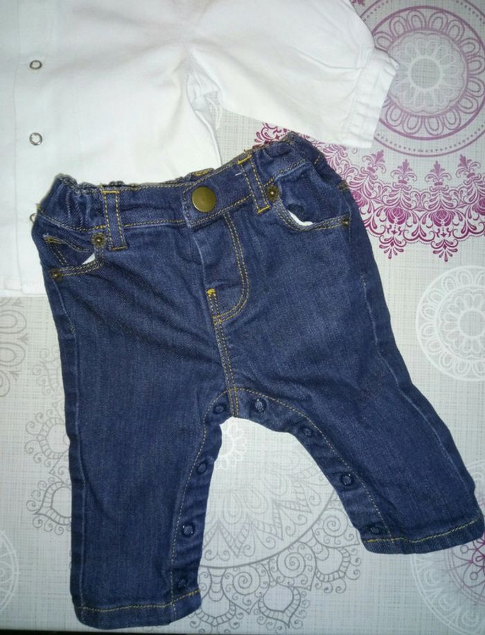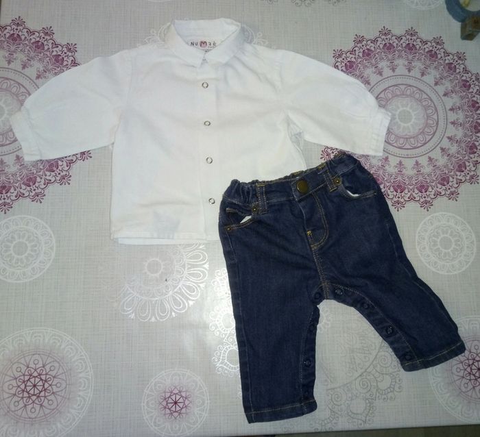 Ensemble chemise blanche en lin et jean's Numaé Paris T. 3 mois Neuf - photo numéro 1