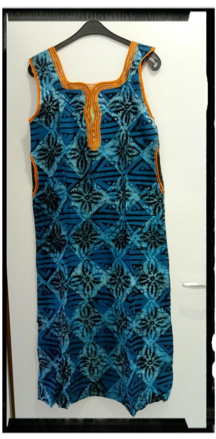 Robe africaine en wax bleu turquoise et broderie orange Poches aux côtés Fait main artisanalement en Côte d'Ivoire Dimensions : Largeur : 53 cm Hauteur : 130 cm Neuve #bebelle_78robes_africaines #bebelle_78wax