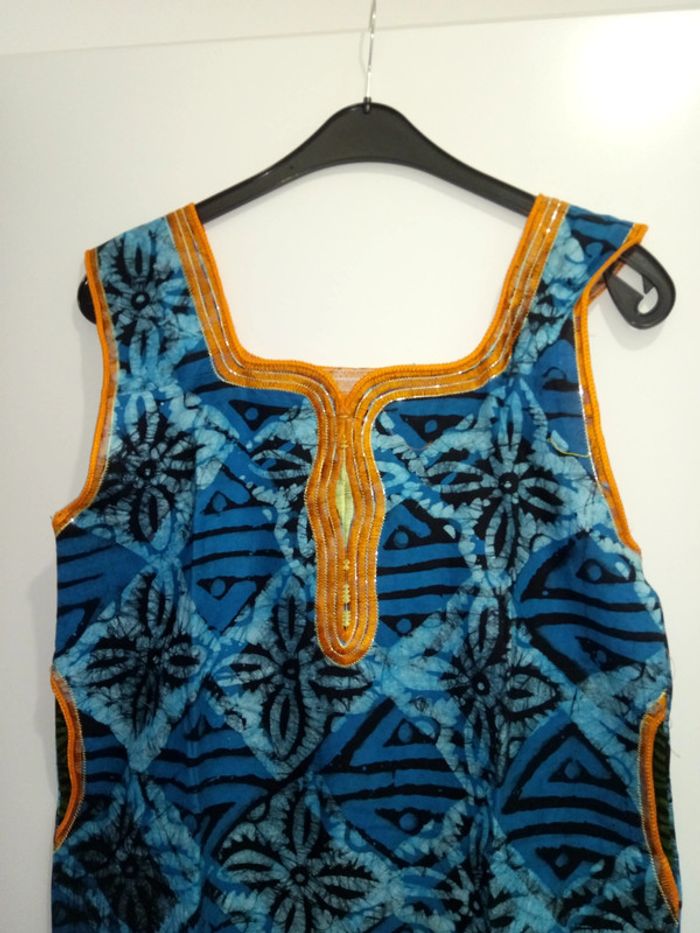 Robe africaine wax bleu turquoise et broderie orange Neuve
