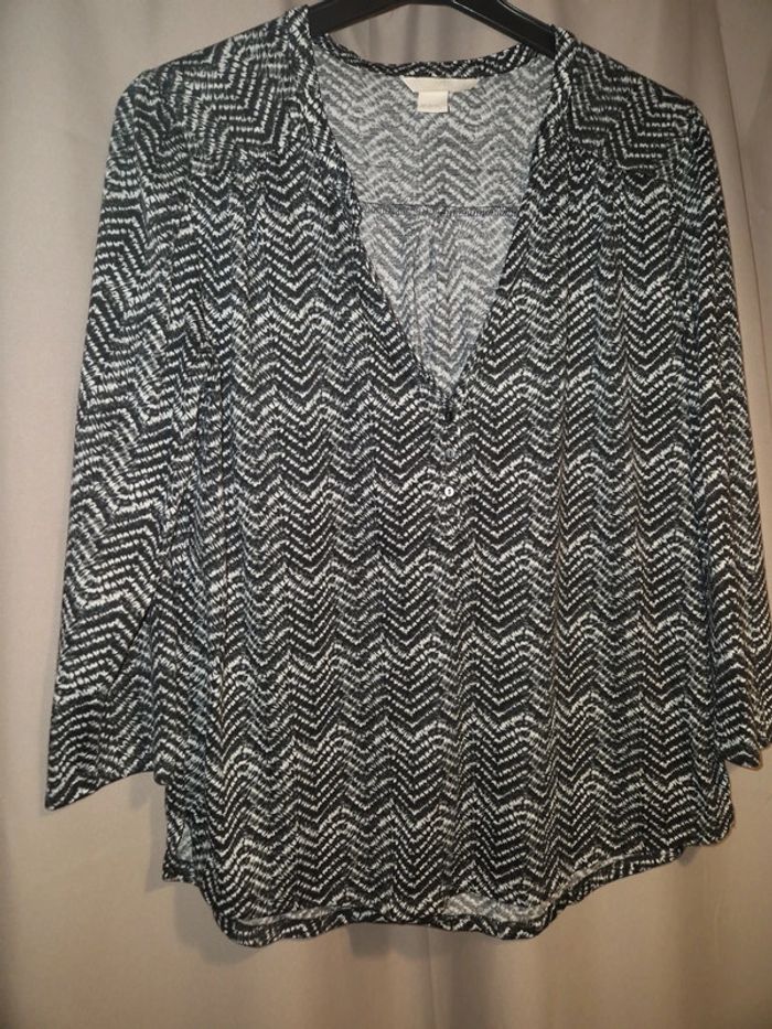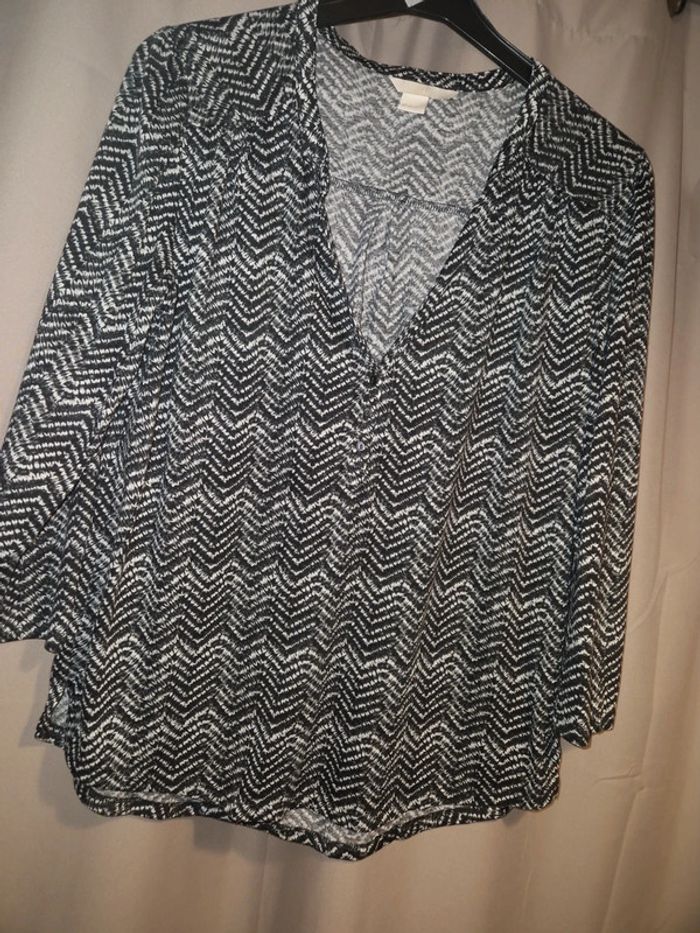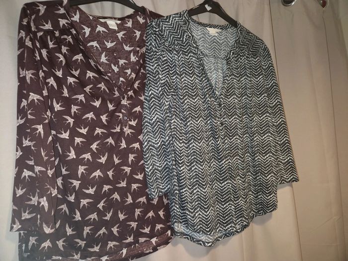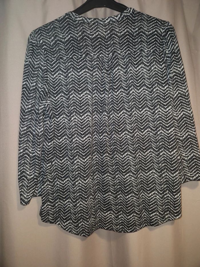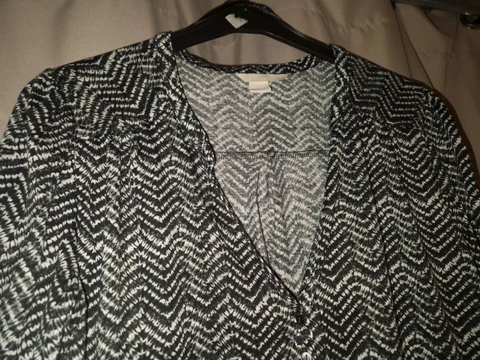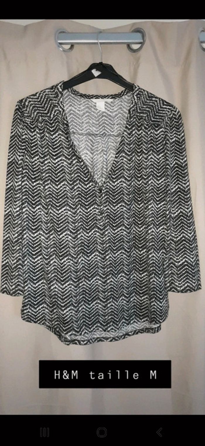 Jolie tunique / blouse avec imprimé noir et blanc Facile à porter. Autant avec une jupe qu'un slim... Très peu portée M mais davantage 40 N'hésitez pas à consulter l'ensemble de mon dressing, beaucoup de choses 😉 #blouse #tunique #manche3quarts #imprimé #rayures #h&m