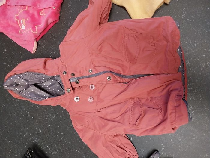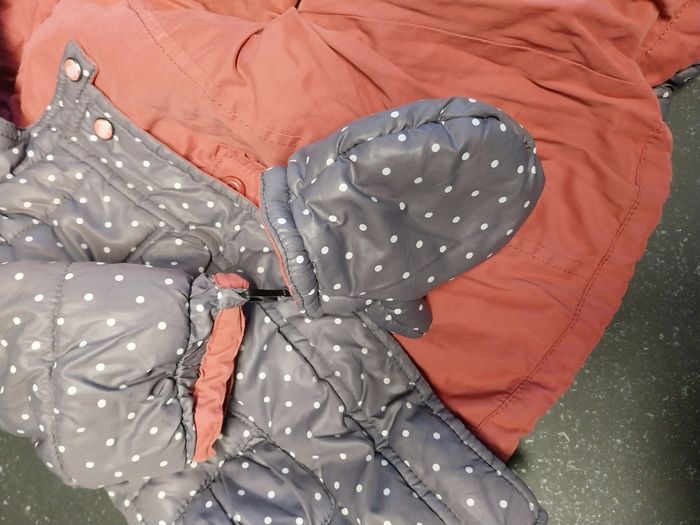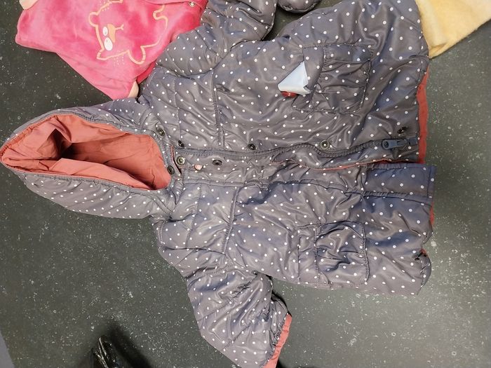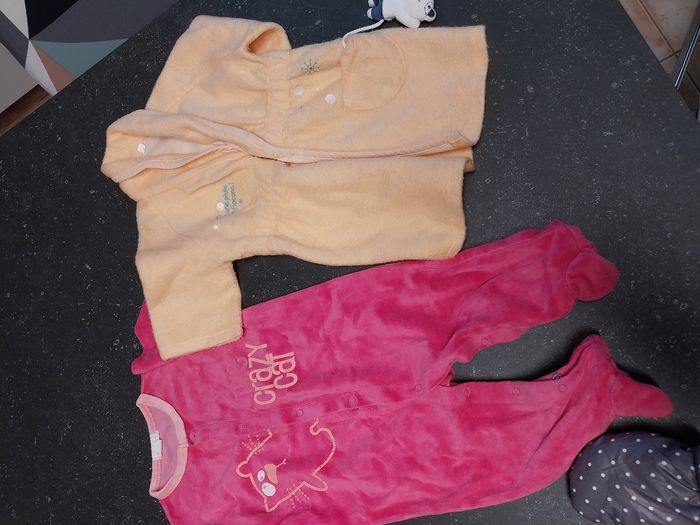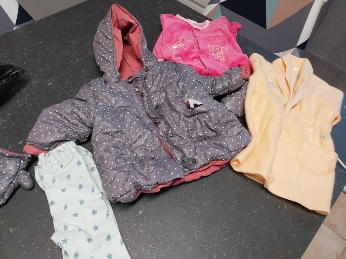 Le lot 9 mois comprend 1 veste réversible vertbaudet avec ses moufles 1 grenouillère kimadi 1 robe de chambre 1 pantalon kiabi