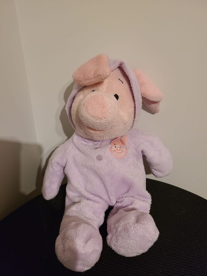 : Nicotoy - Disney Baby - Gémo - Vétir Taille : environ 24 cm Doudou cochon rose Porcinet en pyjama avec capuche violet 108