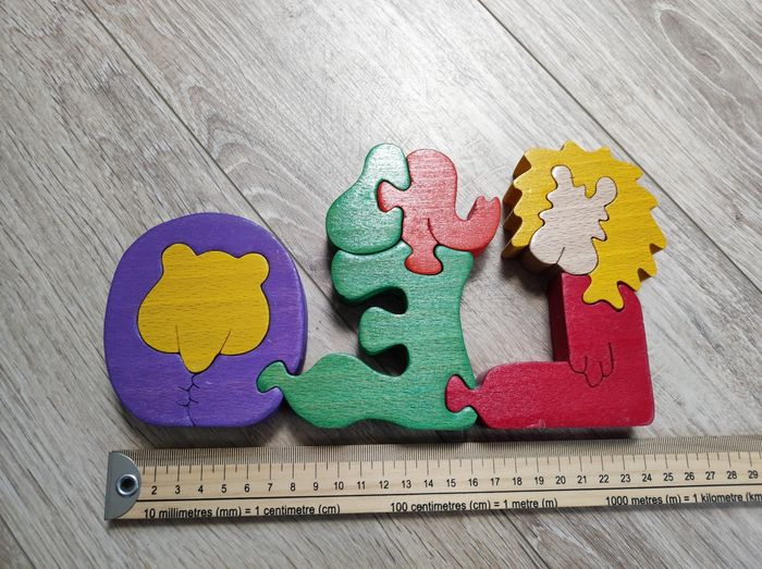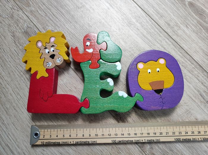Prénom en bois Léo version puzzle . modèle artisanal. Quelques légères marques d'usures en bas. Longueur 24 cm environ