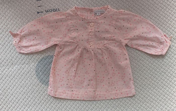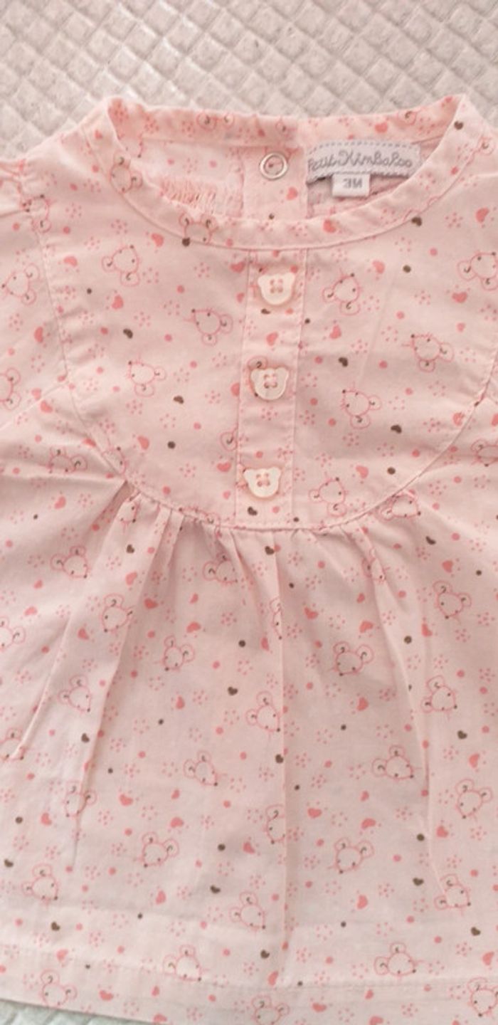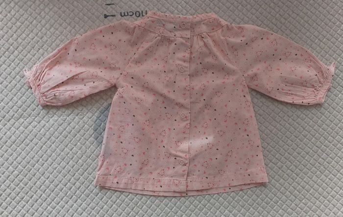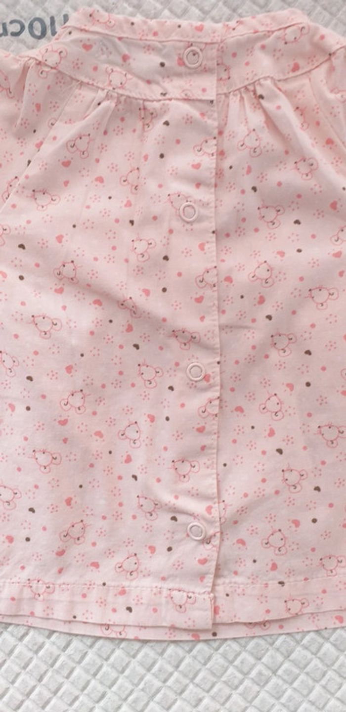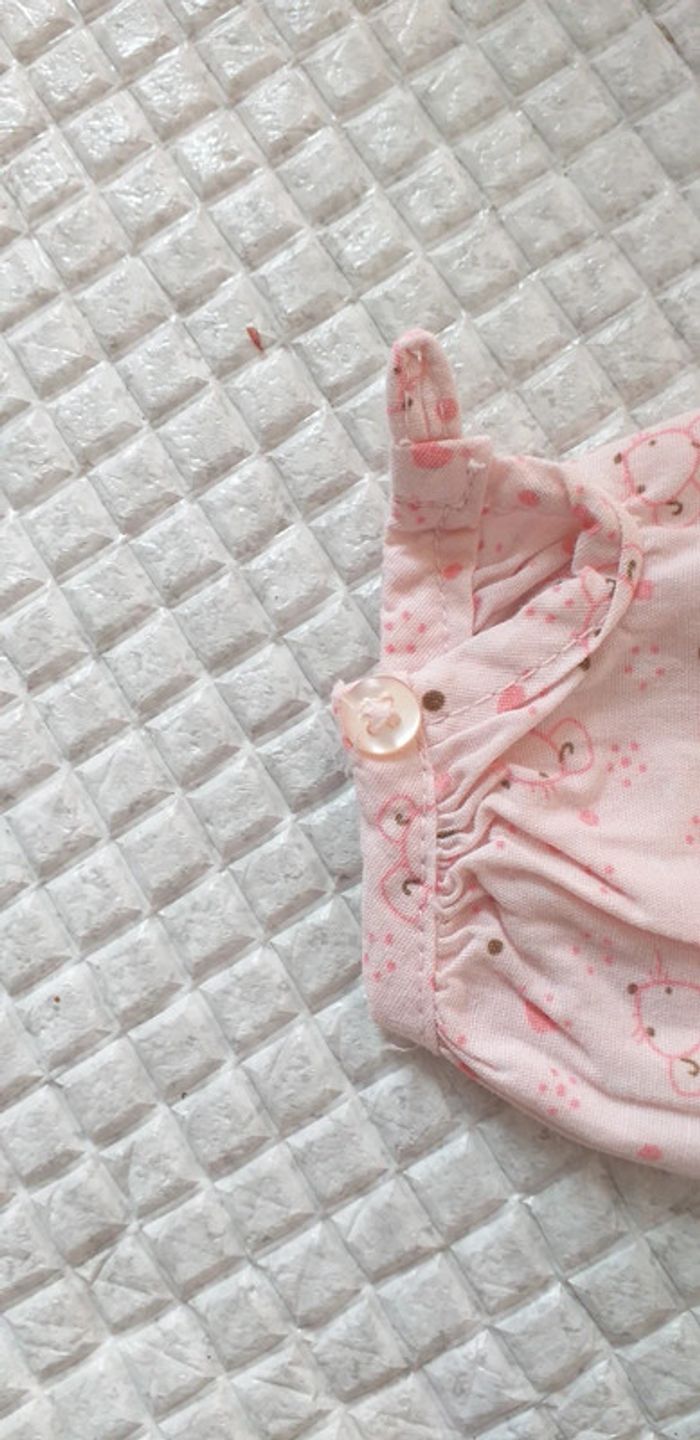 Porté plusieurs fois. Tunique avec des boutons décoratifs devant et dessins de souris. Fermeture au niveau des poignées par boutons et boutons pressions dans le dos. Taille 3 mois.