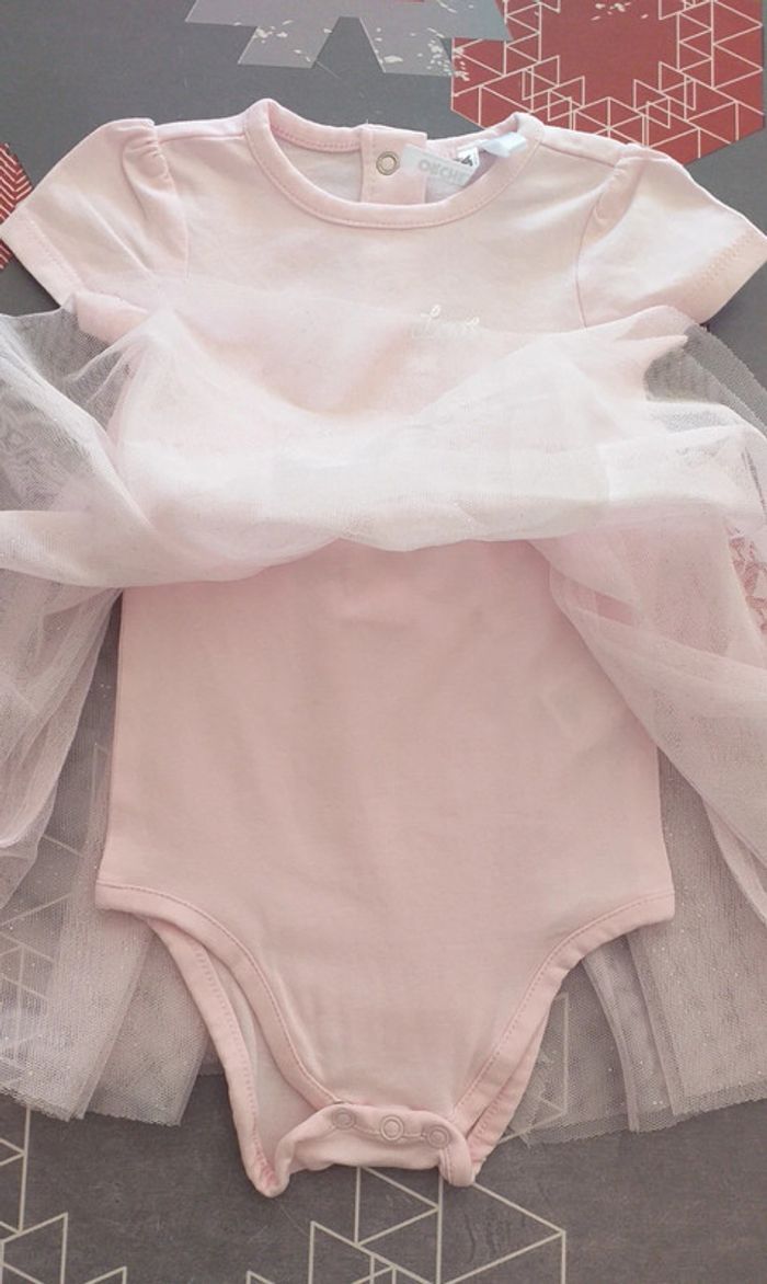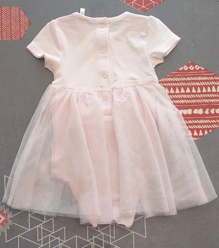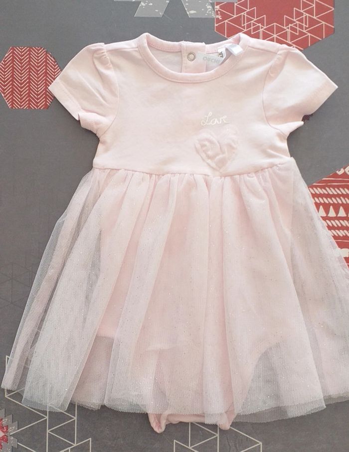 Porté peu de fois. Petite robe tulle avec bodie en dessous. Fermeture dans le dos par boutons pressions. Taille 3 mois.