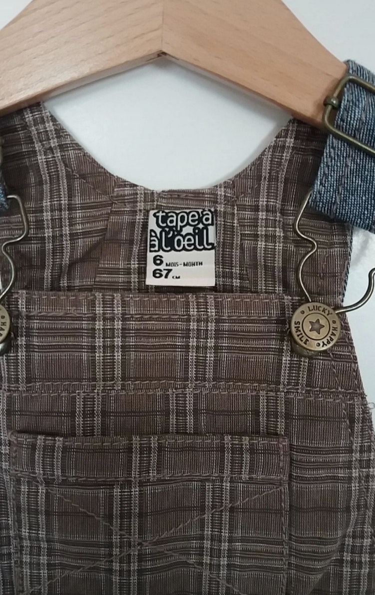 Salopette à carreaux marron claire et blanche semi saison Fermeture par pressions à l’intérieur des jambes pour changer bébé 100 % coton Très bon état peu porté Taille correctement Idéal avec le T shirt bordeaux disponible dans le dressing D'autres articles #sloang44_G6M #sloang44_tapealoeil